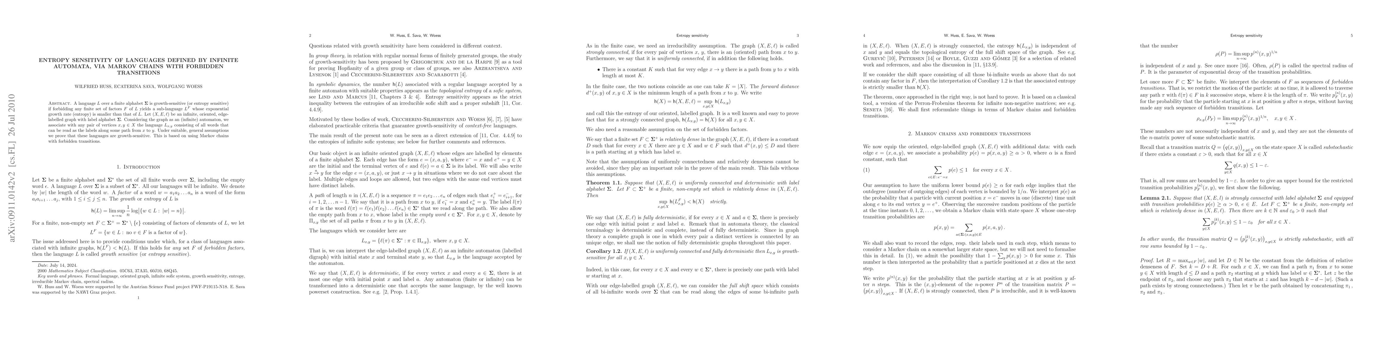 A language L over a finite alphabet is growth-sensitive (or entropy sensitive) if forbidding any set of subwords F yields a sub-language L^F whose exponential growth rate (entropy) is smaller than that of L. Let (X, E, l) be an infinite, oriented, labelled graph. Considering the graph as an (infinite) automaton, we associate with any pair of vertices x,y in X the language consisting of all words that can be read as the labels along some path from x to y. Under suitable, general assumptions we prove that these languages are growth-sensitive. This is based on using Markov chains with forbidden transitions.