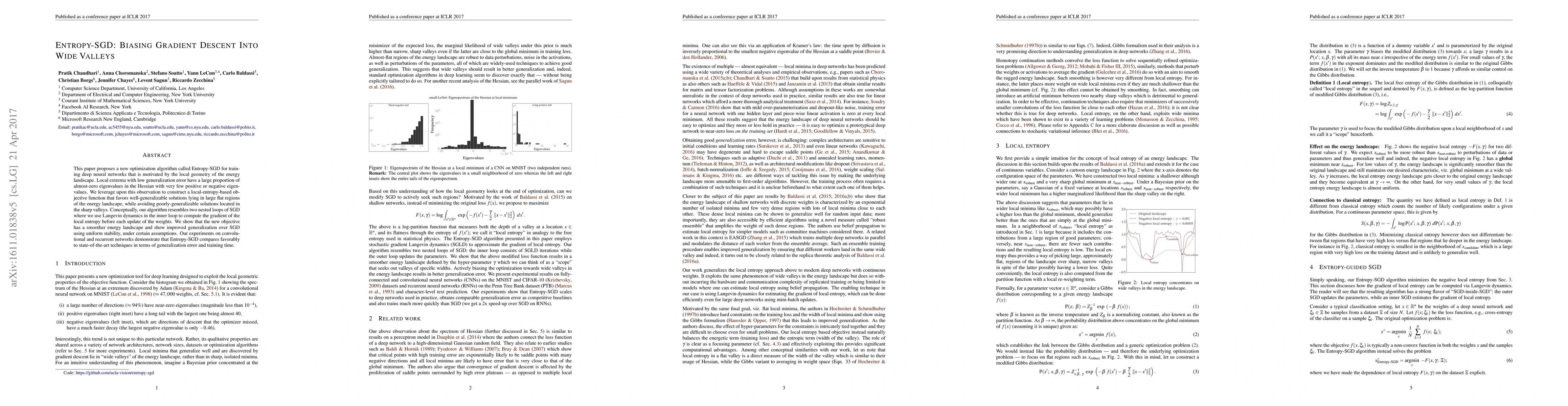 Entropy-SGD is a novel optimization algorithm designed to enhance the training of deep neural networks by favoring solutions in wide, flat regions of the energy landscape, thereby improving generalization. The method employs a local-entropy-based objective function and nested SGD loops, showing improved generalization and performance compared to standard SGD.