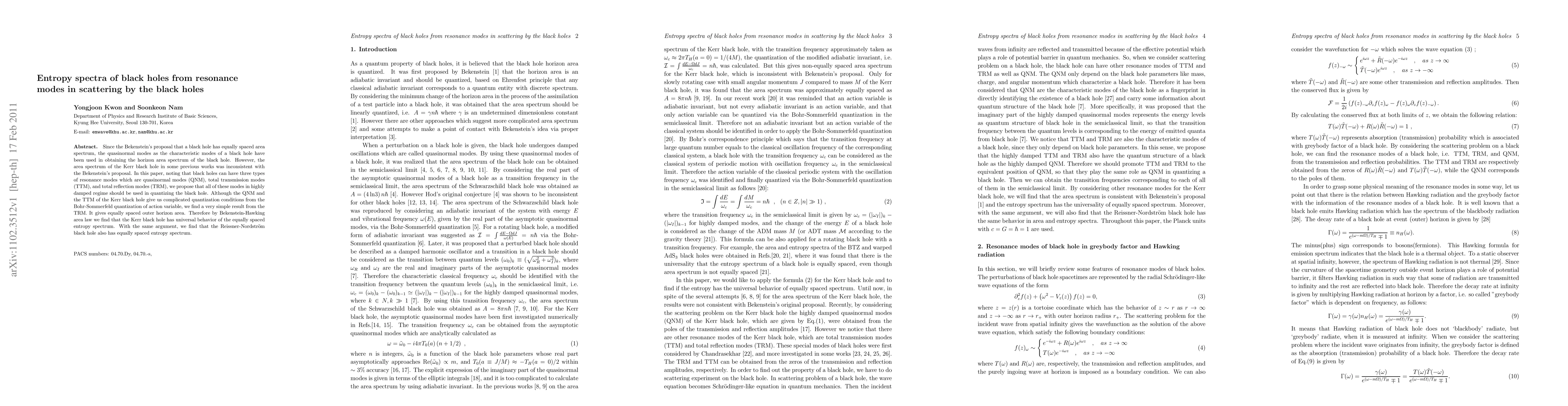 This paper proposes using three types of resonance modes—quasinormal, total transmission, and total reflection—to quantize black holes, leading to a universal equally spaced entropy spectrum for both Kerr and Reissner-Nordstrom black holes, consistent with Bekenstein's area spectrum hypothesis.