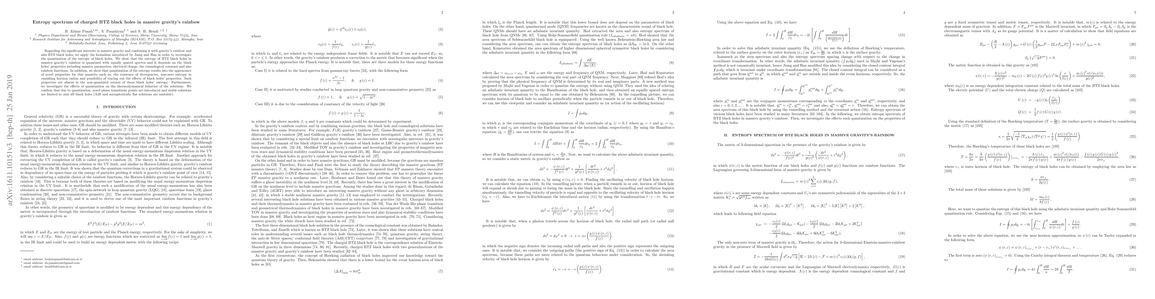 The research quantizes the entropy spectrum of charged BTZ black holes in the context of massive gravity's rainbow, revealing equally spaced entropy spectra dependent on black hole properties. The study highlights novel thermodynamic behaviors, including divergences, non-zero entropy at vanishing horizon radius, and limited stable solutions to de Sitter black holes.