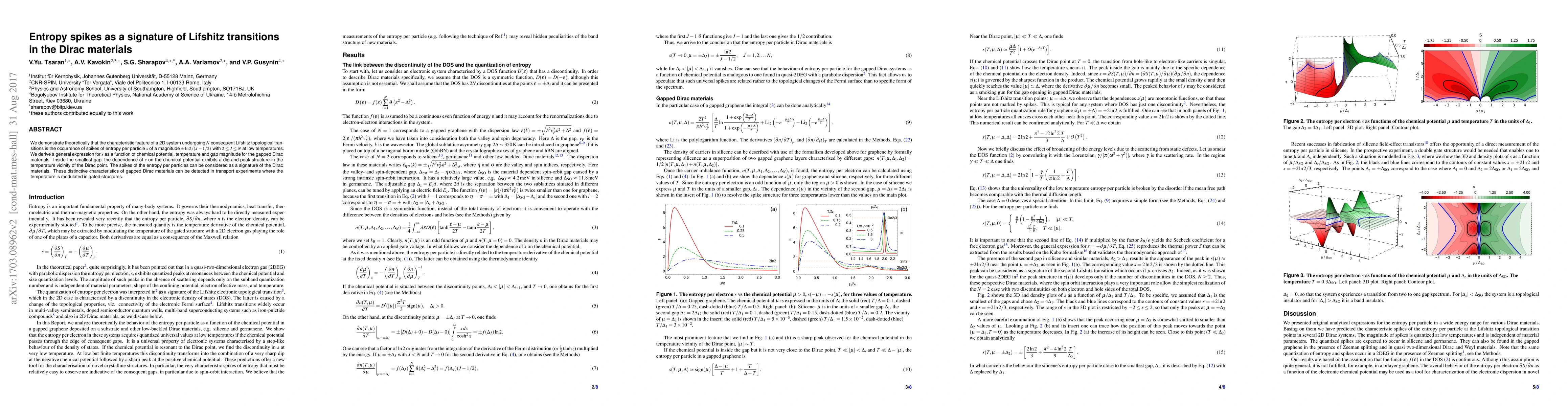 This paper theoretically shows that entropy spikes in 2D Dirac materials undergoing Lifshitz transitions are signatures of these transitions, with a magnitude of $\pm \ln 2/(J-1/2)$ for $2 \leq J \leq N$. These spikes can be detected in transport experiments, particularly near the Dirac point.