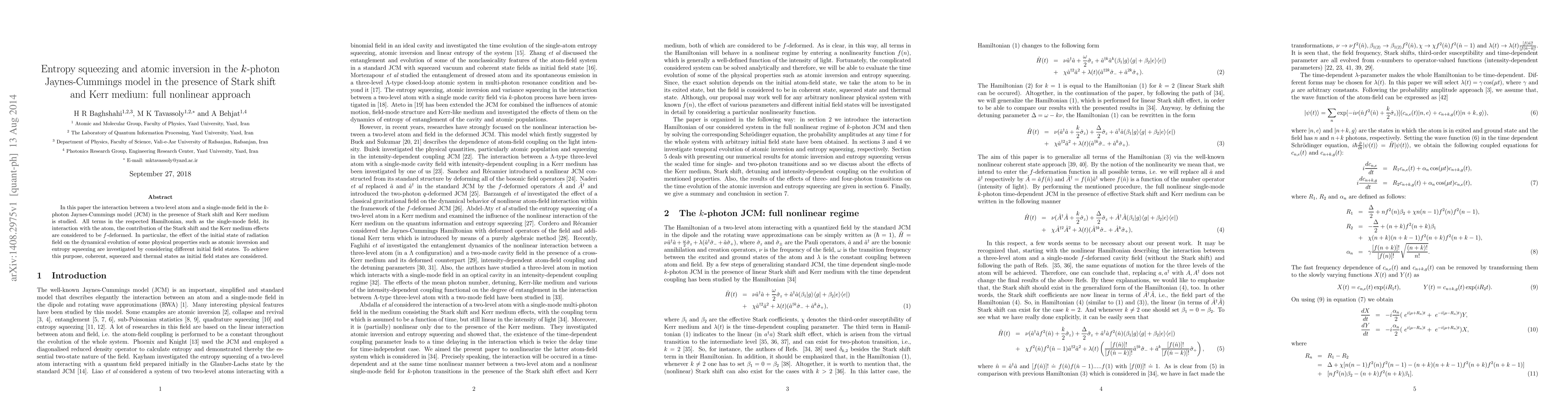 This paper investigates the dynamics of a $k$-photon Jaynes-Cummings model with Stark shift and Kerr medium effects, focusing on atomic inversion and entropy squeezing. Various initial radiation field states, including coherent, squeezed, and thermal, are analyzed to understand their impact on the system's evolution.