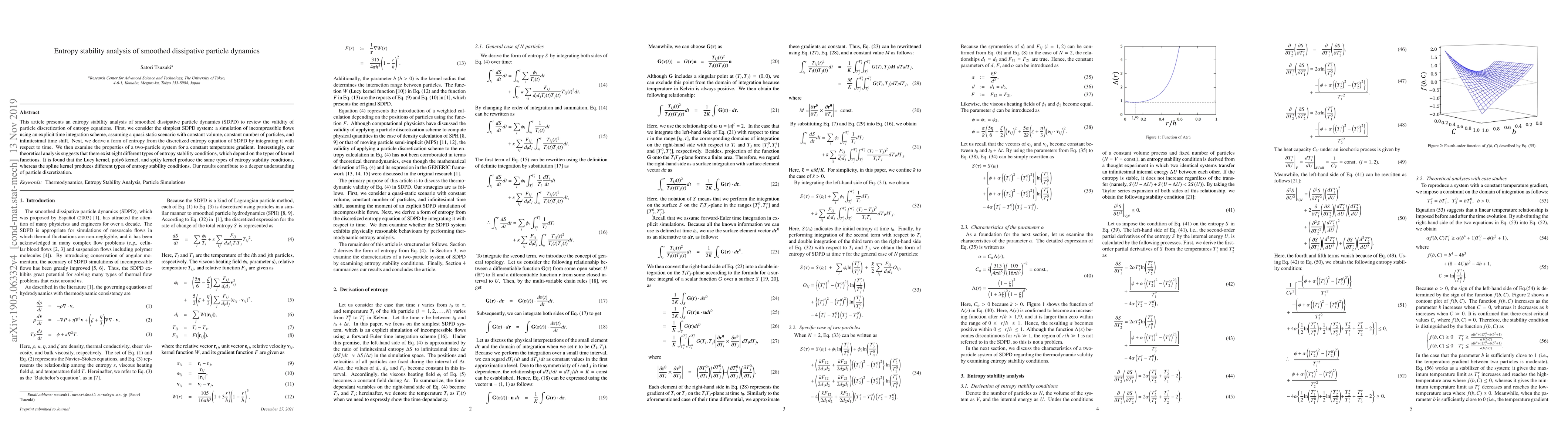 This article presents an entropy stability analysis of smoothed dissipative particle dynamics (SDPD) to review the validity of particle discretization of entropy equations. First, we consider the simplest SDPD system: a simulation of incompressible flows using an explicit time integration scheme, assuming a quasi-static scenario with constant volume, constant number of particles, and infinitesimal time shift. Next, we derive a form of entropy from the discretized entropy equation of SDPD by integrating it with respect to time. We then examine the properties of a two-particle system for a constant temperature gradient. Interestingly, our theoretical analysis suggests that there exist eight different types of entropy stability conditions, which depend on the types of kernel functions. It is found that the Lucy kernel, poly6 kernel, and spiky kernel produce the same types of entropy stability conditions, whereas the spline kernel produces different types of entropy stability conditions. Our results contribute to a deeper understanding of particle discretization.