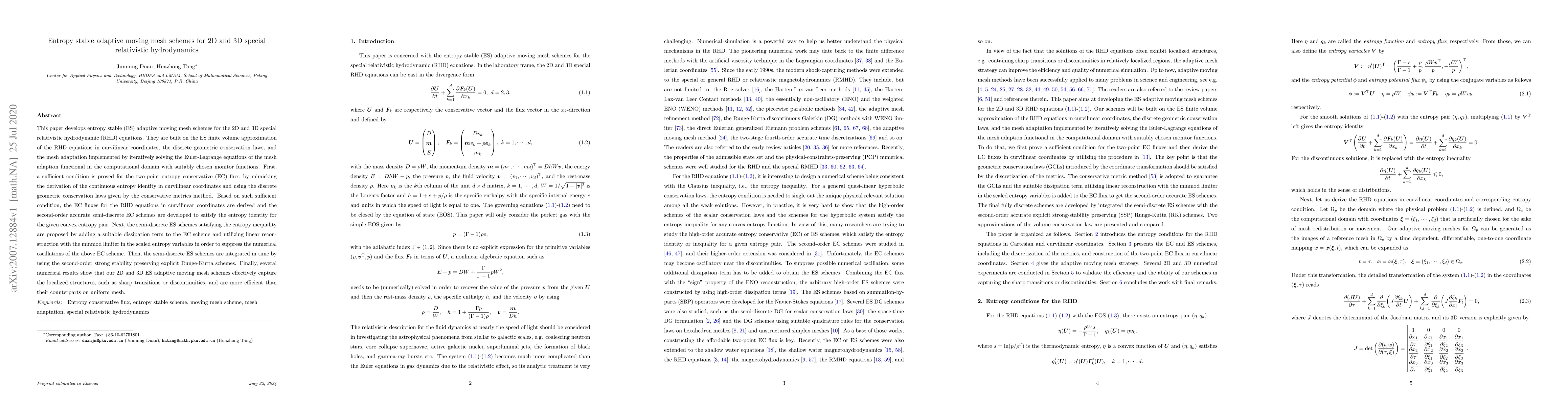 This paper develops entropy stable adaptive moving mesh schemes for 2D and 3D special relativistic hydrodynamics, utilizing entropy conservative fluxes and dissipation terms to suppress oscillations, and demonstrating their efficiency in capturing localized structures compared to uniform mesh methods.