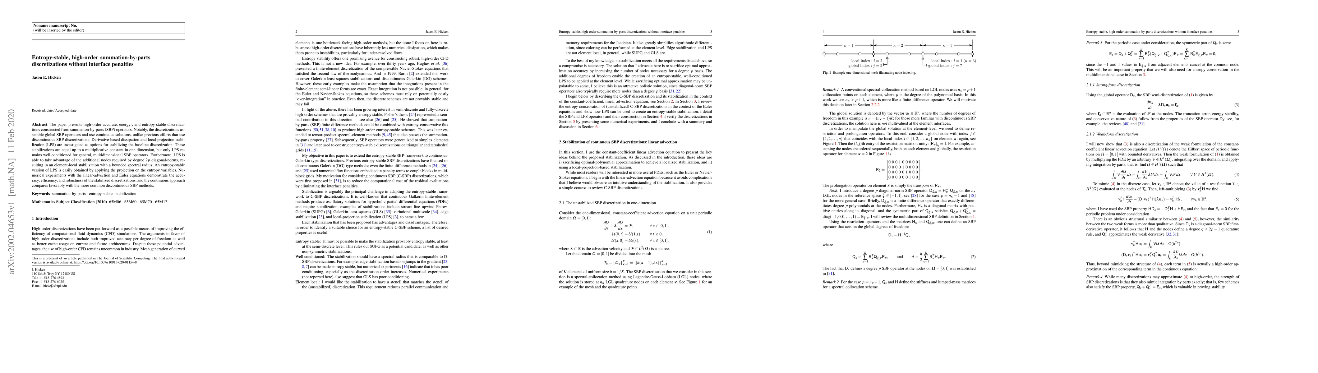 The paper presents high-order accurate, energy-, and entropy-stable discretizations constructed from summation-by-parts (SBP) operators. Notably, the discretizations assemble global SBP operators and use continuous solutions, unlike previous efforts that use discontinuous SBP discretizations. Derivative-based dissipation and local-projection stabilization (LPS) are investigated as options for stabilizing the baseline discretization. These stabilizations are equal up to a multiplicative constant in one dimension, but only LPS remains well conditioned for general, multidimensional SBP operators. Furthermore, LPS is able to take advantage of the additional nodes required by degree $2p$ diagonal-norms, resulting in an element-local stabilization with a bounded spectral radius. An entropy-stable version of LPS is easily obtained by applying the projection on the entropy variables. Numerical experiments with the linear-advection and Euler equations demonstrate the accuracy, efficiency, and robustness of the stabilized discretizations, and the continuous approach compares favorably with the more common discontinuous SBP methods.