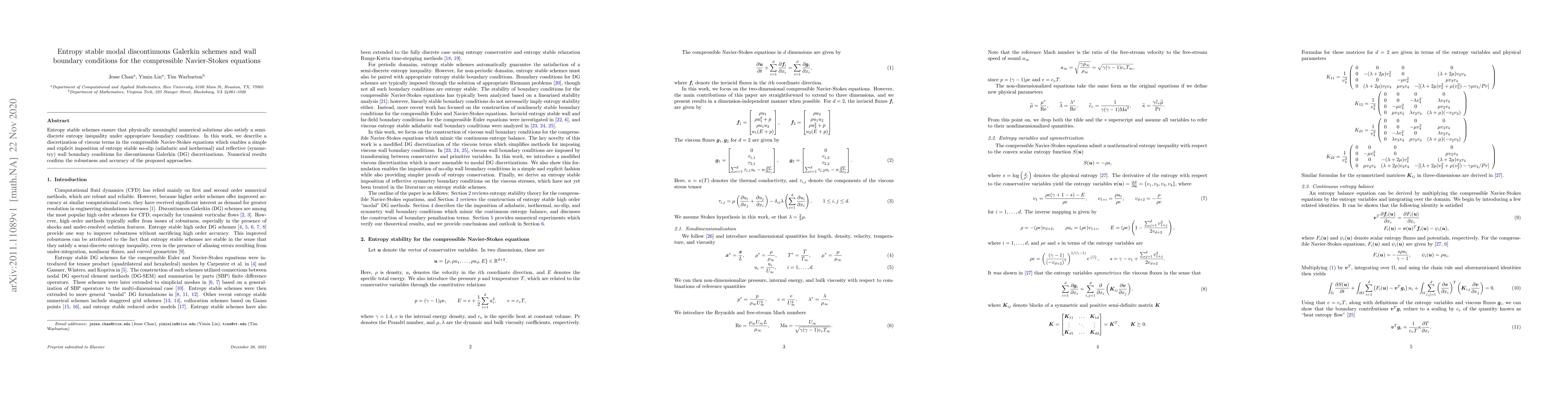 This paper presents entropy stable modal discontinuous Galerkin schemes for the compressible Navier-Stokes equations, focusing on the implementation of no-slip and reflective boundary conditions, which ensures physical accuracy and robustness, as validated by numerical results.