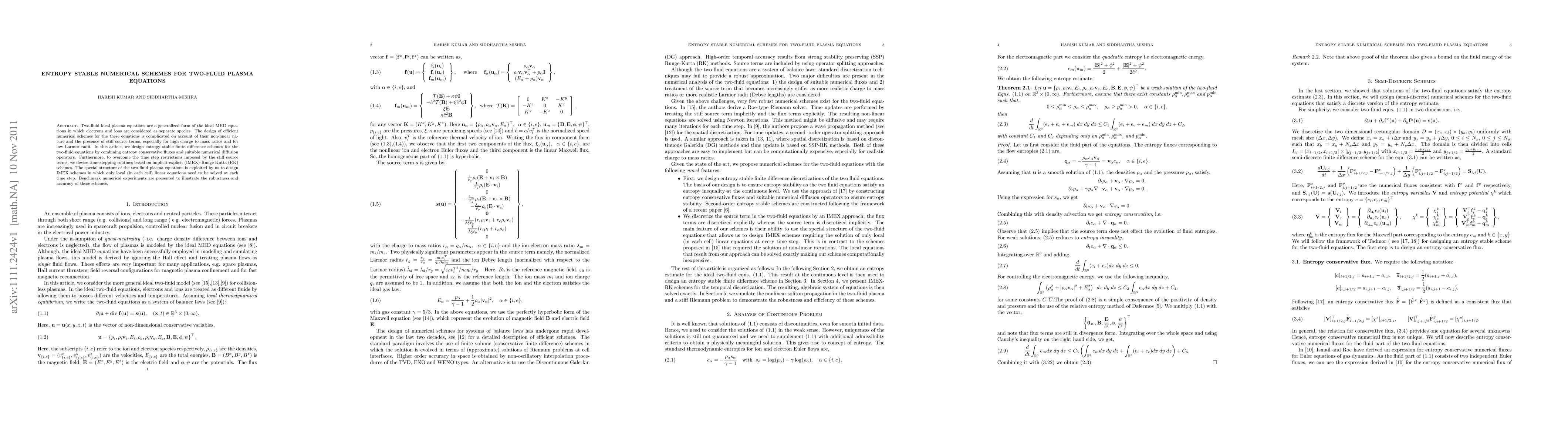 Two-fluid ideal plasma equations are a generalized form of the ideal MHD equations in which electrons and ions are considered as separate species. The design of efficient numerical schemes for the these equations is complicated on account of their non-linear nature and the presence of stiff source terms, especially for high charge to mass ratios and for low Larmor radii. In this article, we design entropy stable finite difference schemes for the two-fluid equations by combining entropy conservative fluxes and suitable numerical diffusion operators. Furthermore, to overcome the time step restrictions imposed by the stiff source terms, we devise time-stepping routines based on implicit-explicit (IMEX)-Runge Kutta (RK) schemes. The special structure of the two-fluid plasma equations is exploited by us to design IMEX schemes in which only local (in each cell) linear equations need to be solved at each time step. Benchmark numerical experiments are presented to illustrate the robustness and accuracy of these schemes.