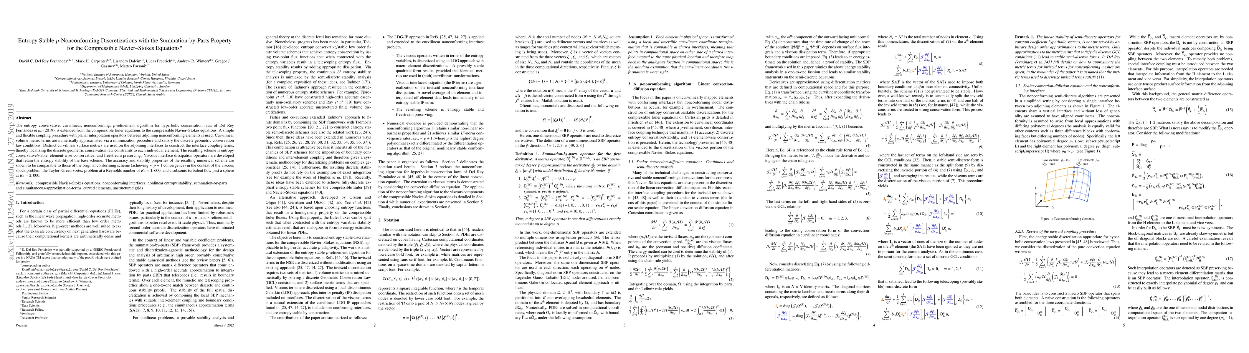 The entropy conservative, curvilinear, nonconforming, p-refinement algorithm for hyperbolic conservation laws of Del Rey Fernandez et al. (2019), is extended from the compressible Euler equations to the compressible Navier-Stokes equations. A simple and flexible coupling procedure with planar interpolation operators between adjoining nonconforming elements is used. Curvilinear volume metric terms are numerically approximated via a minimization procedure and satisfy the discrete geometric conservation law conditions. Distinct curvilinear surface metrics are used on the adjoining interfaces to construct the interface coupling terms, thereby localizing the discrete geometric conservation law constraints to each individual element. The resulting scheme is entropy conservative/stable, element-wise conservative, and freestream preserving. Viscous interface dissipation operators are developed that retain the entropy stability of the base scheme. The accuracy and stability properties of the resulting numerical scheme are shown to be comparable to those of the original conforming scheme (achieving ~p+1 convergence) in the context of the viscous shock problem, the Taylor-Green vortex problem at a Reynolds number of Re=1,600, and a subsonic turbulent flow past a sphere at Re = 2,000.