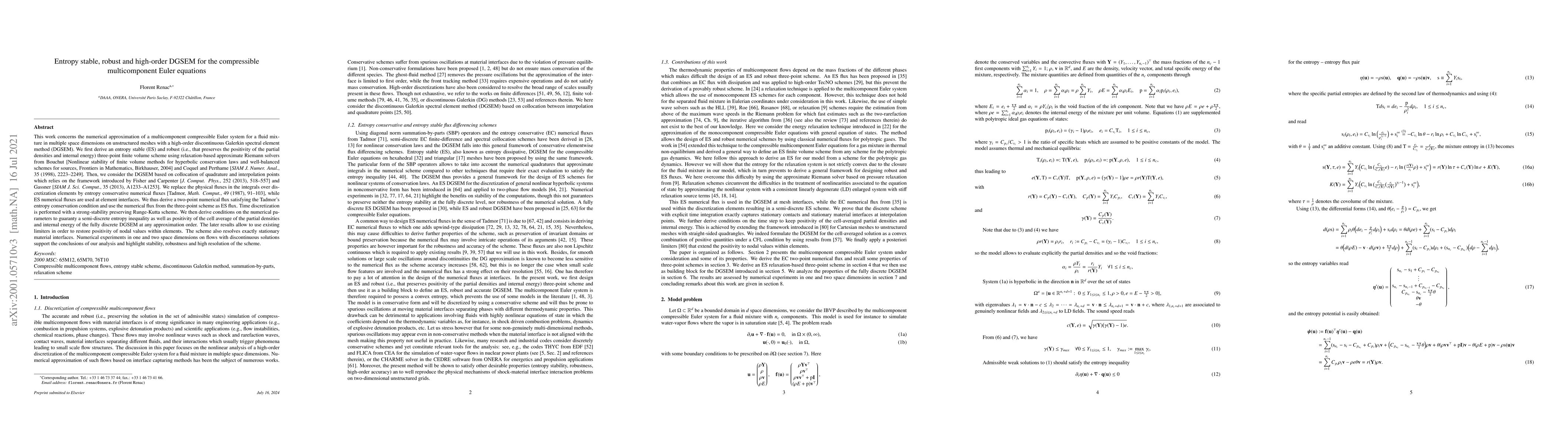This work concerns the numerical approximation of a multicomponent compressible Euler system for a fluid mixture in multiple space dimensions on unstructured meshes with a high-order discontinuous Galerkin spectral element method (DGSEM). We first derive an entropy stable (ES) and robust (i.e., that preserves the positivity of the partial densities and internal energy) three-point finite volume scheme using relaxation-based approximate Riemann solvers from Bouchut [Nonlinear stability of finite volume methods for hyperbolic conservation laws and well-balanced schemes for sources, Birkhauser] and Coquel and Perthame [SINUM, 35, 1998]. Then, we consider the DGSEM based on collocation of quadrature and interpolation points which relies on the framework introduced by Fisher and Carpenter [JCP, 252, 2013] and Gassner [SISC, 35, 2013]. We replace the physical fluxes in the integrals over discretization elements by entropy conservative numerical fluxes [Tadmor, MCOM, 49, 1987], while ES numerical fluxes are used at element interfaces. We thus derive a two-point numerical flux satisfying the Tadmor's entropy conservation condition and use the numerical flux from the three-point scheme as ES flux. Time discretization is performed with a strong-stability preserving Runge-Kutta scheme. We then derive conditions on the numerical parameters to guaranty a semi-discrete entropy inequality as well as positivity of the cell average of the partial densities and internal energy of the fully discrete DGSEM at any approximation order. The later results allow to use existing limiters in order to restore positivity of nodal values within elements. The scheme also resolves exactly stationary material interfaces. Numerical experiments in one and two space dimensions on flows with discontinuous solutions support the conclusions of our analysis and highlight stability, robustness and high resolution of the scheme.