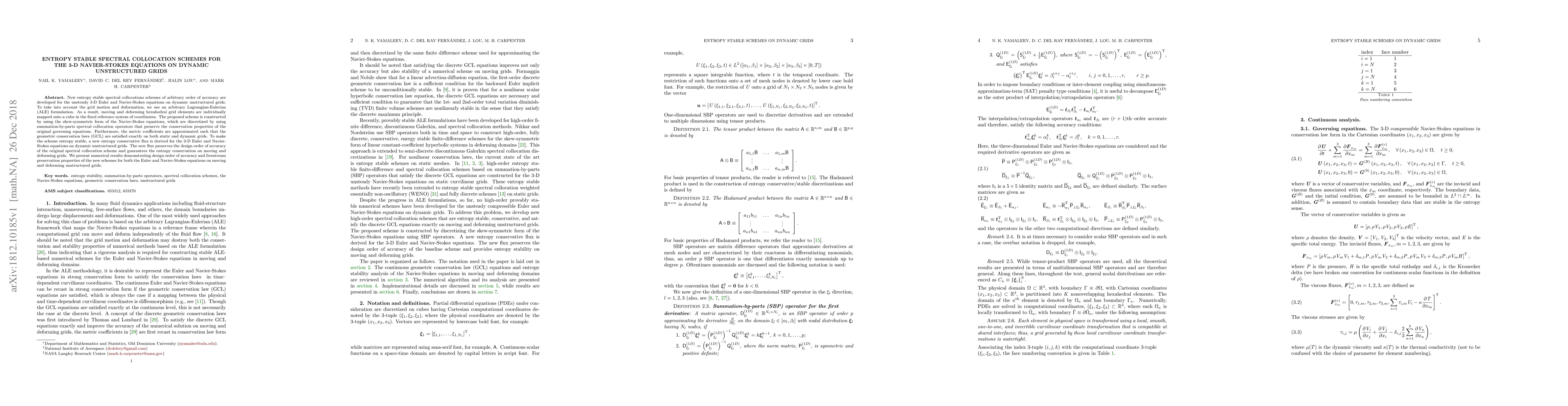 This paper introduces entropy stable spectral collocation schemes for 3-D Euler and Navier-Stokes equations on dynamic unstructured grids, using an ALE formulation and summation-by-parts operators to maintain conservation and geometric conservation laws. The new entropy conservative flux ensures accuracy and entropy conservation on moving grids.