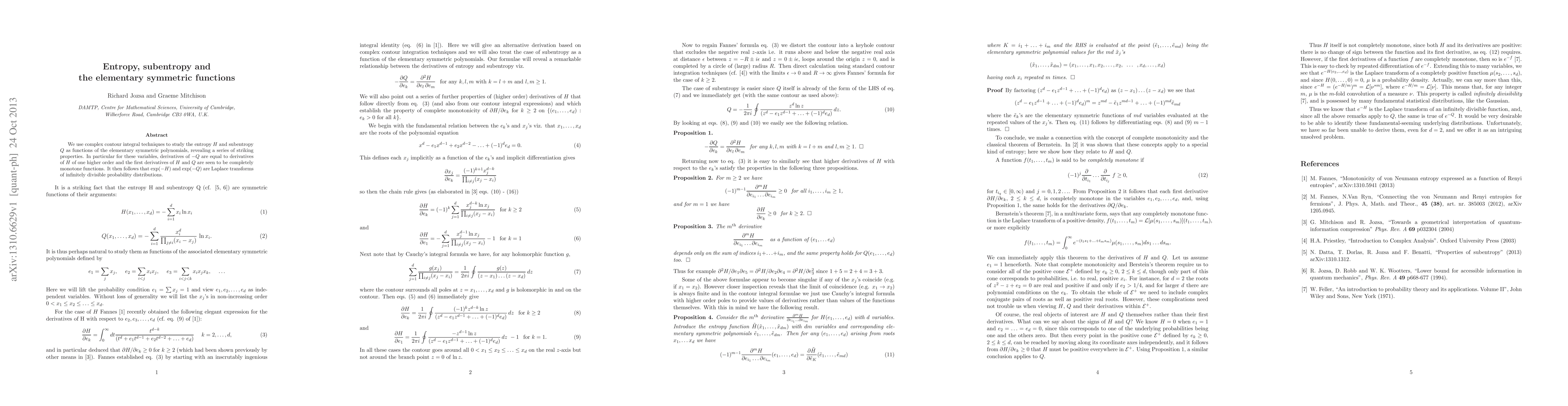 This paper uses complex contour integral techniques to study entropy and subentropy as functions of elementary symmetric polynomials, revealing properties including equal derivatives and Laplace transforms of infinitely divisible distributions.