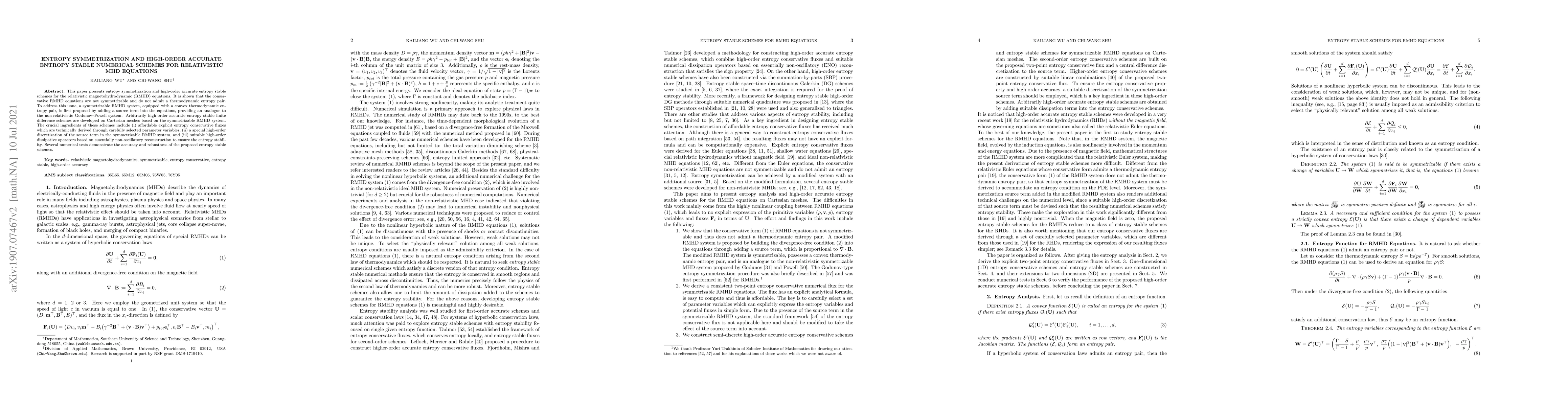 This paper presents entropy symmetrization and high-order accurate entropy stable schemes for the relativistic magnetohydrodynamic (RMHD) equations. It is shown that the conservative RMHD equations are not symmetrizable and do not admit a thermodynamic entropy pair. To address this issue, a symmetrizable RMHD system, equipped with a convex thermodynamic entropy pair, is proposed by adding a source term into the equations, providing an analogue to the non-relativistic Godunov--Powell system. Arbitrarily high-order accurate entropy stable finite difference schemes are developed on Cartesian meshes based on the symmetrizable RMHD system. The crucial ingredients of these schemes include (i) affordable explicit entropy conservative fluxes which are technically derived through carefully selected parameter variables, (ii) a special high-order discretization of the source term in the symmetrizable RMHD system, and (iii) suitable high-order dissipative operators based on essentially non-oscillatory reconstruction to ensure the entropy stability. Several numerical tests demonstrate the accuracy and robustness of the proposed entropy stable schemes.