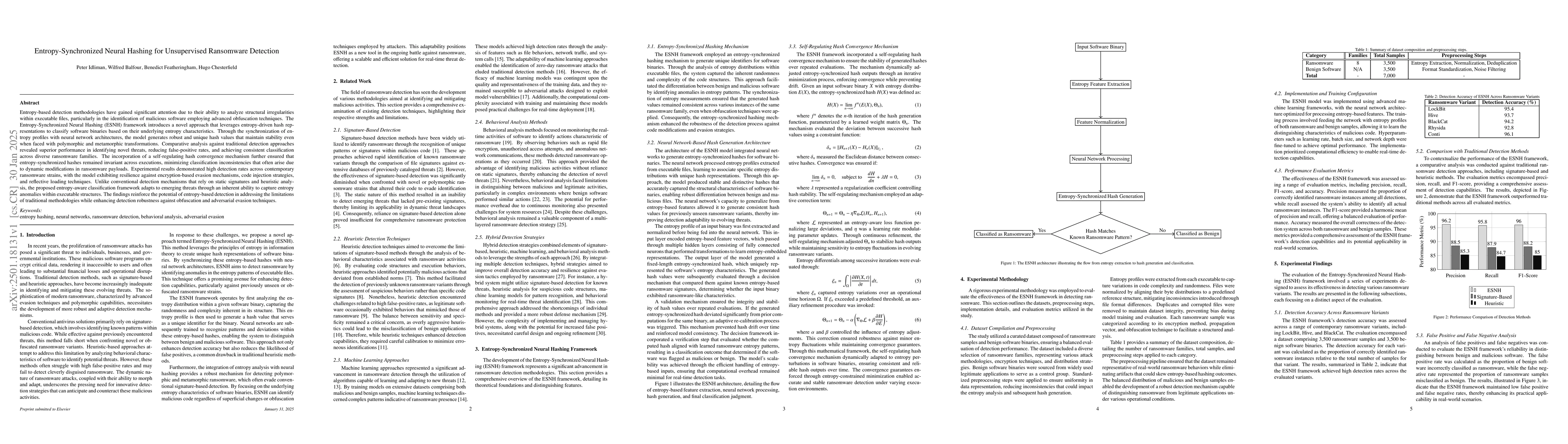 Entropy-based detection methodologies have gained significant attention due to their ability to analyze structural irregularities within executable files, particularly in the identification of malicious software employing advanced obfuscation techniques. The Entropy-Synchronized Neural Hashing (ESNH) framework introduces a novel approach that leverages entropy-driven hash representations to classify software binaries based on their underlying entropy characteristics. Through the synchronization of entropy profiles with neural network architectures, the model generates robust and unique hash values that maintain stability even when faced with polymorphic and metamorphic transformations. Comparative analysis against traditional detection approaches revealed superior performance in identifying novel threats, reducing false-positive rates, and achieving consistent classification across diverse ransomware families. The incorporation of a self-regulating hash convergence mechanism further ensured that entropy-synchronized hashes remained invariant across executions, minimizing classification inconsistencies that often arise due to dynamic modifications in ransomware payloads. Experimental results demonstrated high detection rates across contemporary ransomware strains, with the model exhibiting resilience against encryption-based evasion mechanisms, code injection strategies, and reflective loading techniques. Unlike conventional detection mechanisms that rely on static signatures and heuristic analysis, the proposed entropy-aware classification framework adapts to emerging threats through an inherent ability to capture entropy anomalies within executable structures. The findings reinforce the potential of entropy-based detection in addressing the limitations of traditional methodologies while enhancing detection robustness against obfuscation and adversarial evasion techniques.