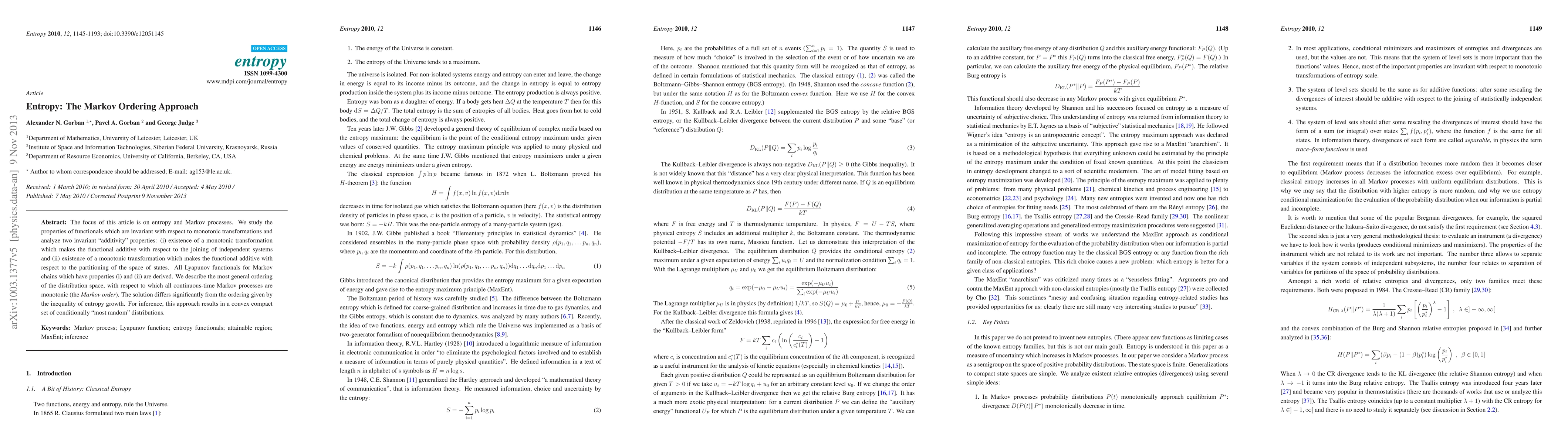 This paper explores entropy in the context of Markov processes, deriving Lyapunov functionals that exhibit invariance under monotonic transformations. It introduces a novel Markov order that differs from traditional entropy growth inequality, leading to a convex set of "most random" distributions.