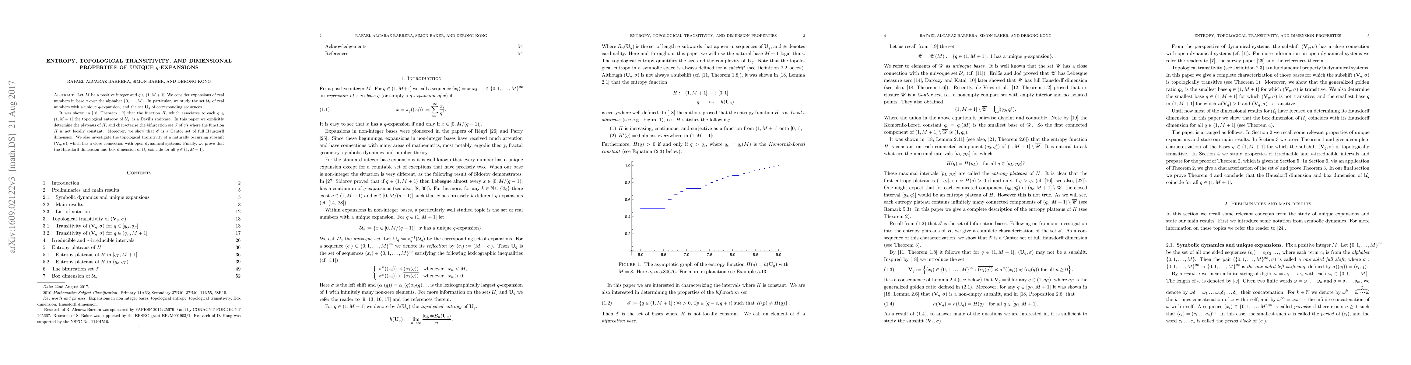 Let $M$ be a positive integer and $q \in(1,M+1].$ We consider expansions of real numbers in base $q$ over the alphabet $\{0,\ldots, M\}$. In particular, we study the set $\mathcal{U}_{q}$ of real numbers with a unique $q$-expansion, and the set $\mathbf{U}_q$ of corresponding sequences. It was shown in (Komornik et al, 2017 Adv. Math.) that the function $H$, which associates to each $q\in(1, M+1]$ the topological entropy of $\mathcal{U}_q$, is a Devil's staircase. In this paper we explicitly determine the plateaus of $H$, and characterize the bifurcation set $\mathcal E$ of $q$'s where the function $H$ is not locally constant. Moreover, we show that $\mathcal E$ is a Cantor set of full Hausdorff dimension. We also investigate the topological transitivity of a naturally occurring subshift $(\mathbf{V}_q, \sigma),$ which has a close connection with open dynamical systems. Finally, we prove that the Hausdorff dimension and box dimension of $\mathcal{U}_q$ coincide for all $q\in(1,M+1]$.