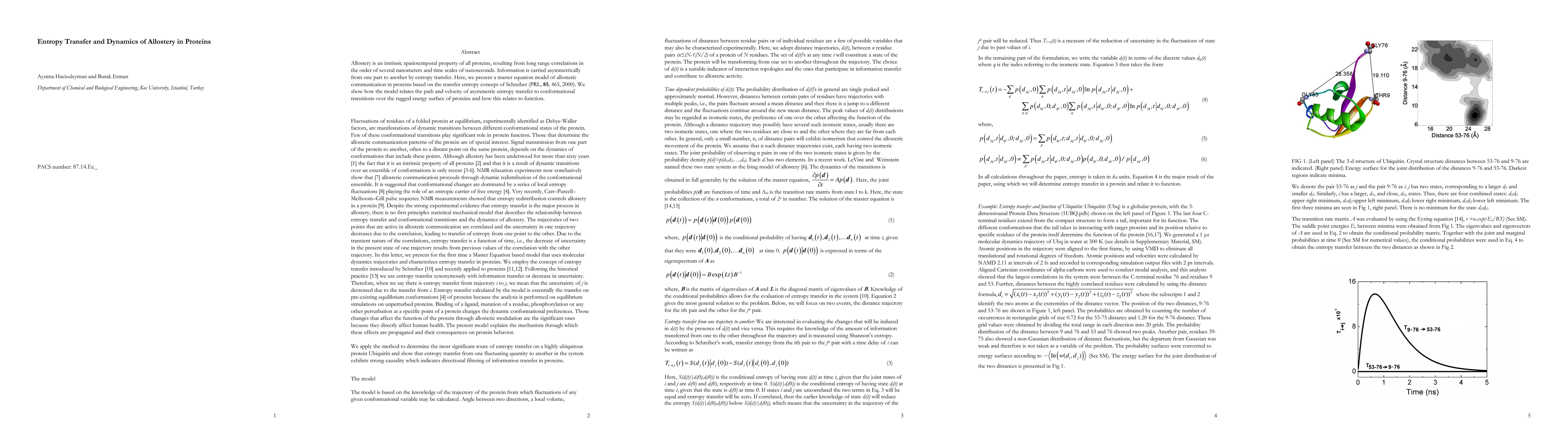 Allostery is an intrinsic spatiotemporal property of all proteins, resulting from long range correlations in the order of several nanometers and time scales of nanoseconds. Information is carried asymmetrically from one part to another by entropy transfer. Here, we present a master equation model of allosteric communication in proteins based on the transfer entropy concept of Schreiber (PRL, 85, 465, 2000). We show how the model relates the path and velocity of asymmetric entropy transfer to conformational transitions over the rugged energy surface of proteins and how this relates to function.