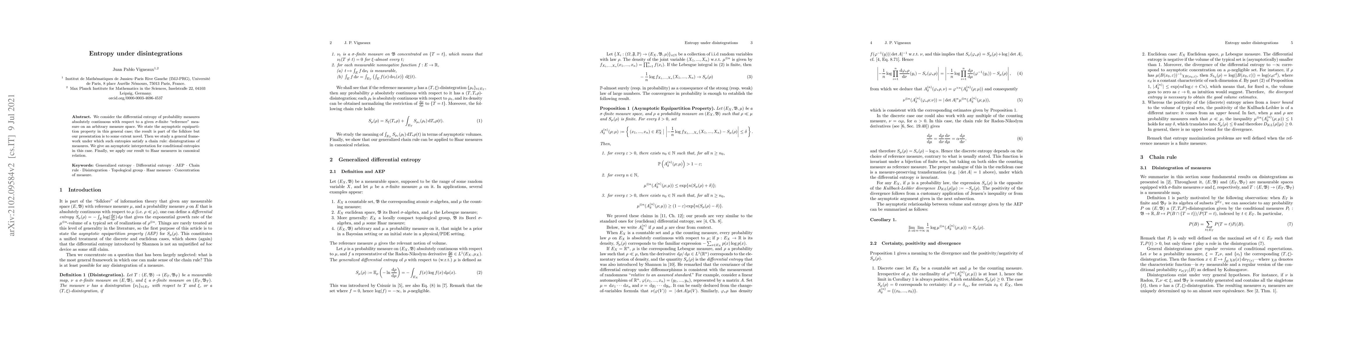We consider the differential entropy of probability measures absolutely continuous with respect to a given $\sigma$-finite reference measure on an arbitrary measurable space. We state the asymptotic equipartition property in this general case; the result is part of the folklore but our presentation is to some extent novel. Then we study a general framework under which such entropies satisfy a chain rule: disintegrations of measures. We give an asymptotic interpretation for conditional entropies in this case. Finally, we apply our result to Haar measures in canonical relation.
