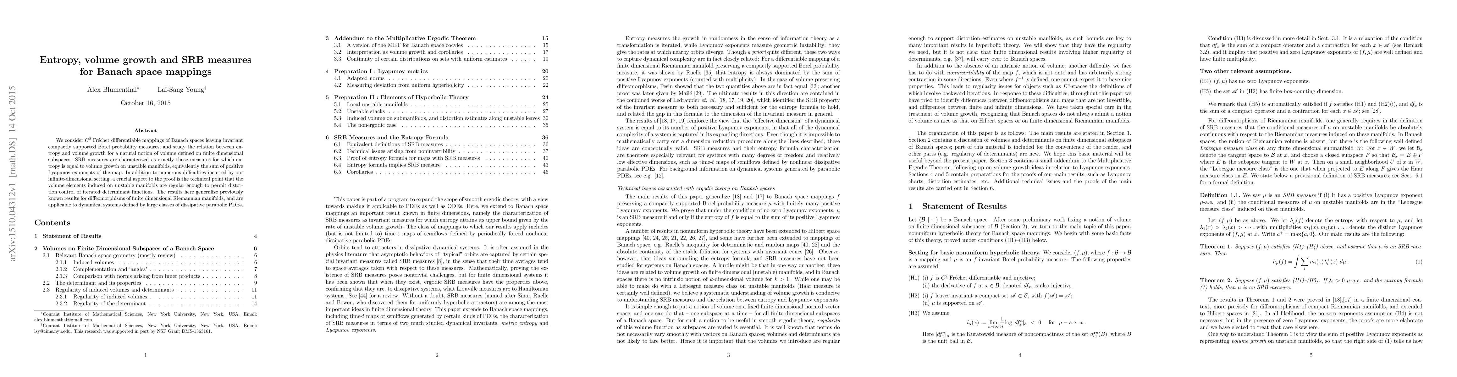 This paper investigates entropy and volume growth for $C^2$ Fr\'echet differentiable mappings on Banach spaces, focusing on invariant compactly supported Borel probability measures. The authors characterize SRB measures as those where entropy equals volume growth on unstable manifolds, linked to the sum of positive Lyapunov exponents.