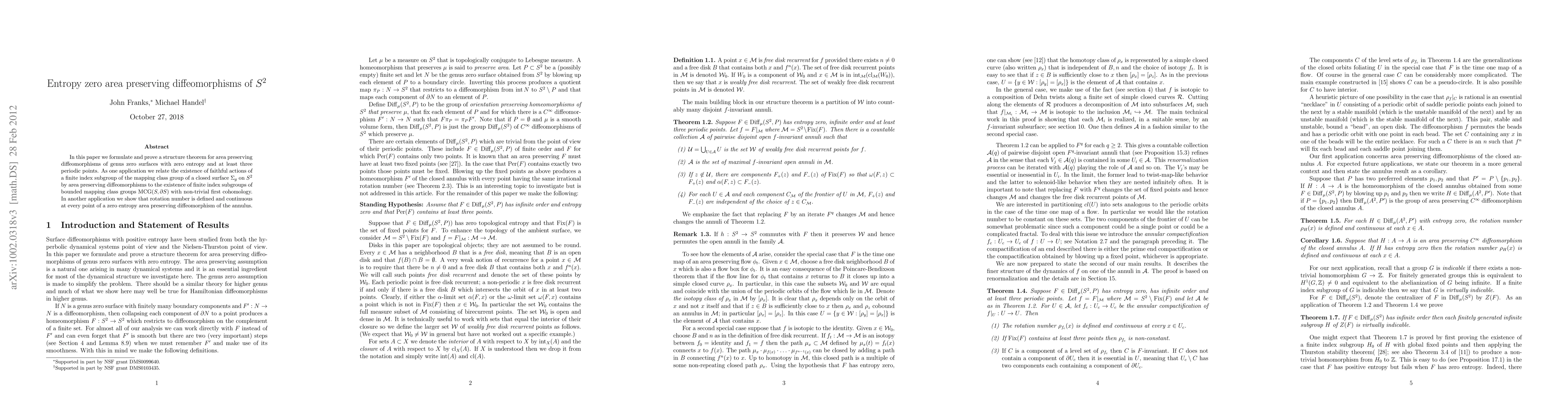 This paper establishes a structure theorem for entropy zero area preserving diffeomorphisms of genus zero surfaces, and links the existence of such diffeomorphisms to the presence of finite index subgroups in mapping class groups with non-trivial first cohomology.