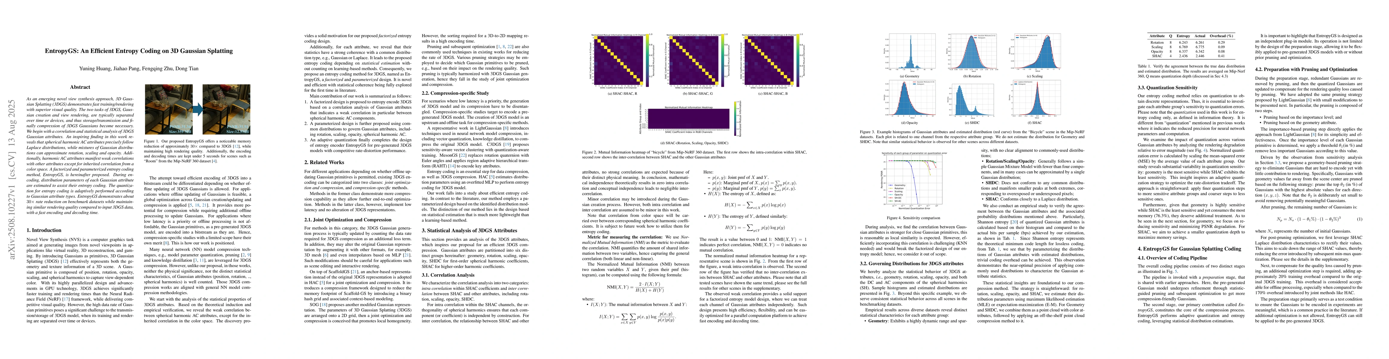 As an emerging novel view synthesis approach, 3D Gaussian Splatting (3DGS) demonstrates fast training/rendering with superior visual quality. The two tasks of 3DGS, Gaussian creation and view rendering, are typically separated over time or devices, and thus storage/transmission and finally compression of 3DGS Gaussians become necessary. We begin with a correlation and statistical analysis of 3DGS Gaussian attributes. An inspiring finding in this work reveals that spherical harmonic AC attributes precisely follow Laplace distributions, while mixtures of Gaussian distributions can approximate rotation, scaling, and opacity. Additionally, harmonic AC attributes manifest weak correlations with other attributes except for inherited correlations from a color space. A factorized and parameterized entropy coding method, EntropyGS, is hereinafter proposed. During encoding, distribution parameters of each Gaussian attribute are estimated to assist their entropy coding. The quantization for entropy coding is adaptively performed according to Gaussian attribute types. EntropyGS demonstrates about 30x rate reduction on benchmark datasets while maintaining similar rendering quality compared to input 3DGS data, with a fast encoding and decoding time.