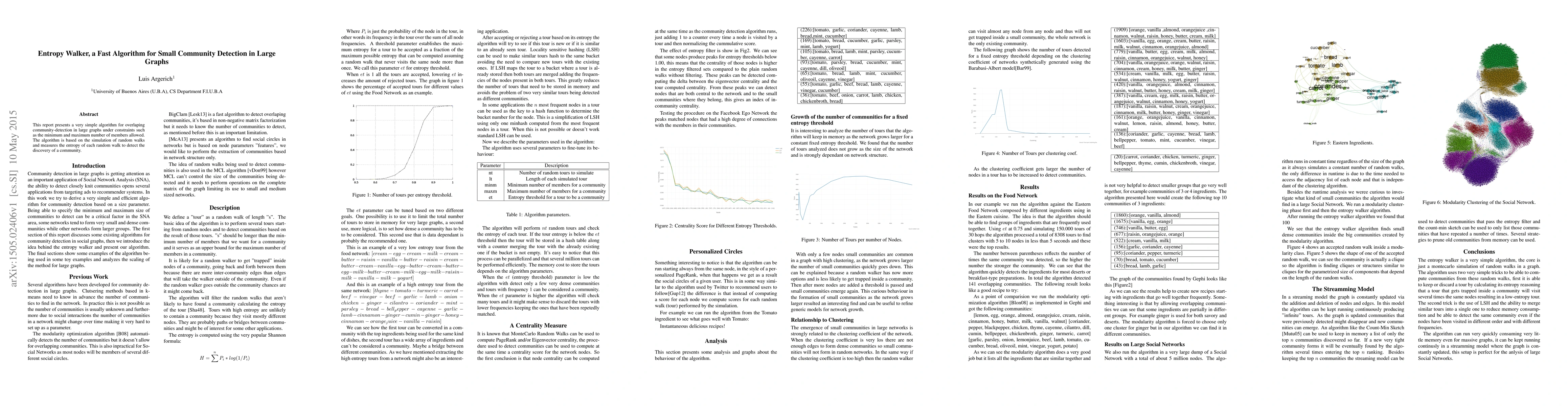 Summary: EntropyWalker is a straightforward algorithm for detecting overlapping communities in large graphs by simulating random walks and using entropy measures. It accommodates constraints like minimum and maximum community sizes.