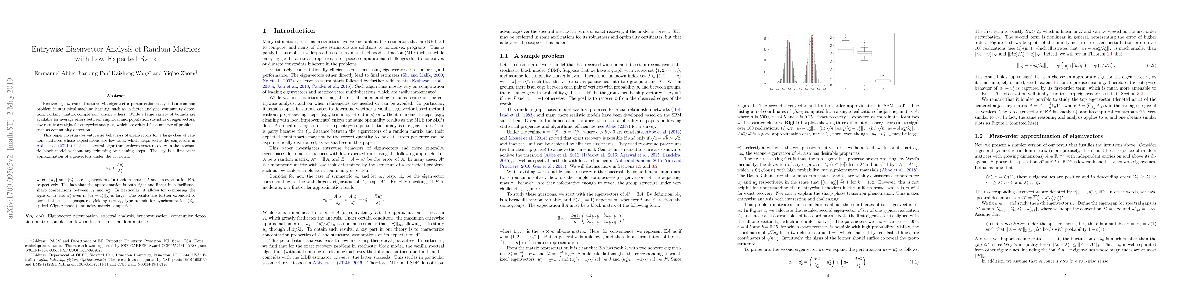 Recovering low-rank structures via eigenvector perturbation analysis is a common problem in statistical machine learning, such as in factor analysis, community detection, ranking, matrix completion, among others. While a large variety of bounds are available for average errors between empirical and population statistics of eigenvectors, few results are tight for entrywise analyses, which are critical for a number of problems such as community detection. This paper investigates entrywise behaviors of eigenvectors for a large class of random matrices whose expectations are low-rank, which helps settle the conjecture in Abbe et al. (2014b) that the spectral algorithm achieves exact recovery in the stochastic block model without any trimming or cleaning steps. The key is a first-order approximation of eigenvectors under the $\ell_\infty$ norm: $$u_k \approx \frac{A u_k^*}{\lambda_k^*},$$ where $\{u_k\}$ and $\{u_k^*\}$ are eigenvectors of a random matrix $A$ and its expectation $\mathbb{E} A$, respectively. The fact that the approximation is both tight and linear in $A$ facilitates sharp comparisons between $u_k$ and $u_k^*$. In particular, it allows for comparing the signs of $u_k$ and $u_k^*$ even if $\| u_k - u_k^*\|_{\infty}$ is large. The results are further extended to perturbations of eigenspaces, yielding new $\ell_\infty$-type bounds for synchronization ($\mathbb{Z}_2$-spiked Wigner model) and noisy matrix completion.
