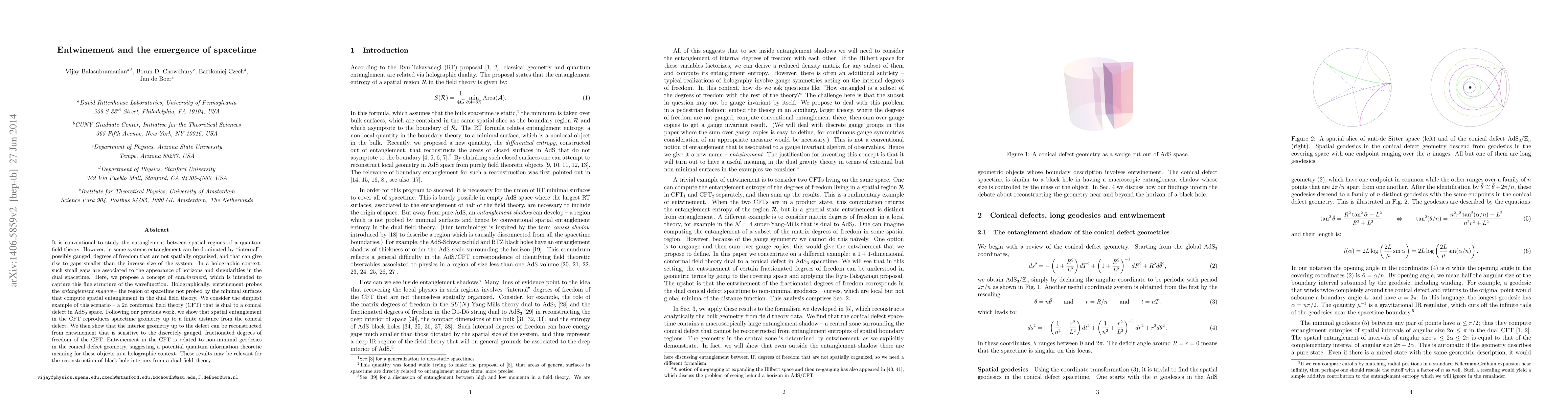 It is conventional to study the entanglement between spatial regions of a quantum field theory. However, in some systems entanglement can be dominated by "internal", possibly gauged, degrees of freedom that are not spatially organized, and that can give rise to gaps smaller than the inverse size of the system. In a holographic context, such small gaps are associated to the appearance of horizons and singularities in the dual spacetime. Here, we propose a concept of entwinement, which is intended to capture this fine structure of the wavefunction. Holographically, entwinement probes the entanglement shadow -- the region of spacetime not probed by the minimal surfaces that compute spatial entanglement in the dual field theory. We consider the simplest example of this scenario -- a 2d conformal field theory (CFT) that is dual to a conical defect in AdS3 space. Following our previous work, we show that spatial entanglement in the CFT reproduces spacetime geometry up to a finite distance from the conical defect. We then show that the interior geometry up to the defect can be reconstructed from entwinement that is sensitive to the discretely gauged, fractionated degrees of freedom of the CFT. Entwinement in the CFT is related to non-minimal geodesics in the conical defect geometry, suggesting a potential quantum information theoretic meaning for these objects in a holographic context. These results may be relevant for the reconstruction of black hole interiors from a dual field theory.