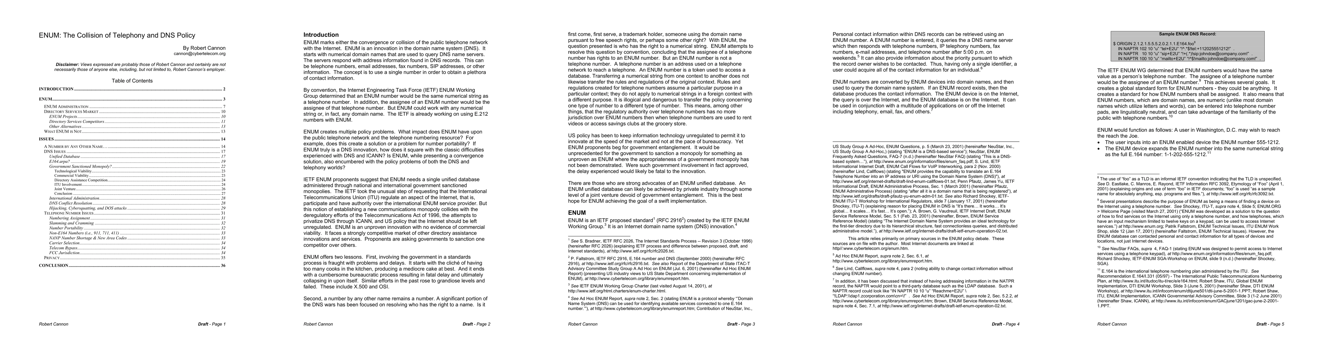 ENUM marks either the convergence or collision of the public telephone network with the Internet. ENUM is an innovation in the domain name system (DNS). It starts with numerical domain names that are used to query DNS name servers. The servers respond with address information found in DNS records. This can be telephone numbers, email addresses, fax numbers, SIP addresses, or other information. The concept is to use a single number in order to obtain a plethora of contact information. By convention, the Internet Engineering Task Force (IETF) ENUM Working Group determined that an ENUM number would be the same numerical string as a telephone number. In addition, the assignee of an ENUM number would be the assignee of that telephone number. But ENUM could work with any numerical string or, in fact, any domain name. The IETF is already working on using E.212 numbers with ENUM. [Abridged]