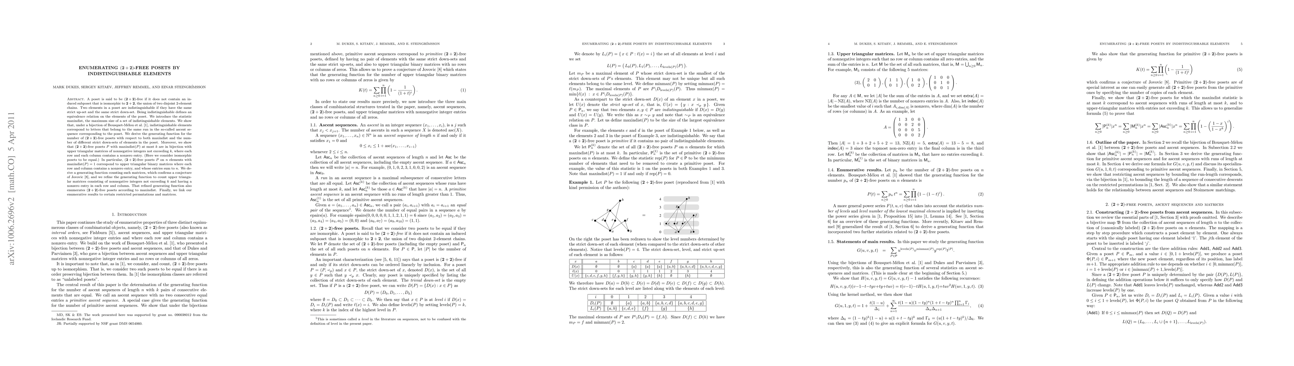 This paper enumerates (2+2)-free posets, which lack induced subposets isomorphic to the union of two disjoint 2-element chains, using the concept of indistinguishable elements. It derives generating functions and establishes a bijection between these posets and upper triangular matrices with specific constraints, confirming and refining previous conjectures.