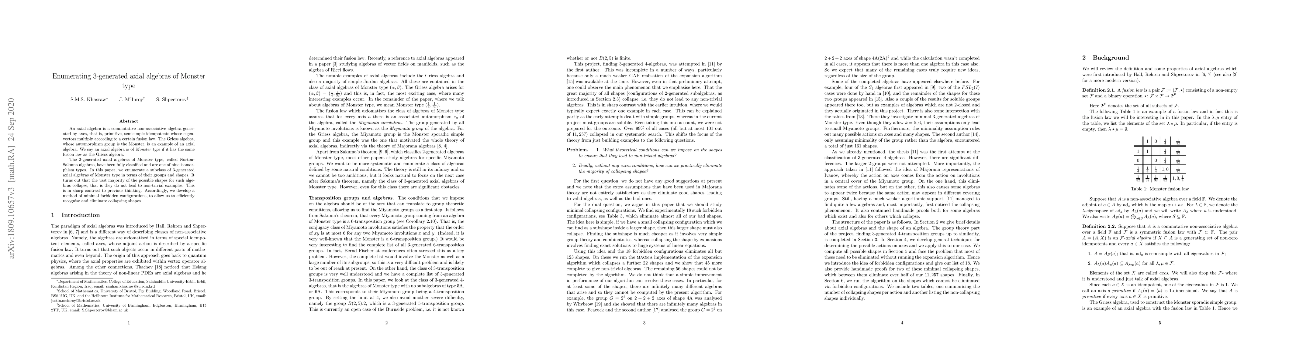 An axial algebra is a commutative non-associative algebra generated by axes, that is, primitive, semisimple idempotents whose eigenvectors multiply according to a certain fusion law. The Griess algebra, whose automorphism group is the Monster, is an example of an axial algebra. We say an axial algebra is of Monster type if it has the same fusion law as the Griess algebra. The $2$-generated axial algebras of Monster type, called Norton-Sakuma algebras, have been fully classified and are one of nine isomorphism types. In this paper, we enumerate a subclass of $3$-generated axial algebras of Monster type in terms of their groups and shapes. It turns out that the vast majority of the possible shapes for such algebras collapse; that is they do not lead to non-trivial examples. This is in sharp contrast to previous thinking. Accordingly, we develop a method of minimal forbidden configurations, to allow us to efficiently recognise and eliminate collapsing shapes.