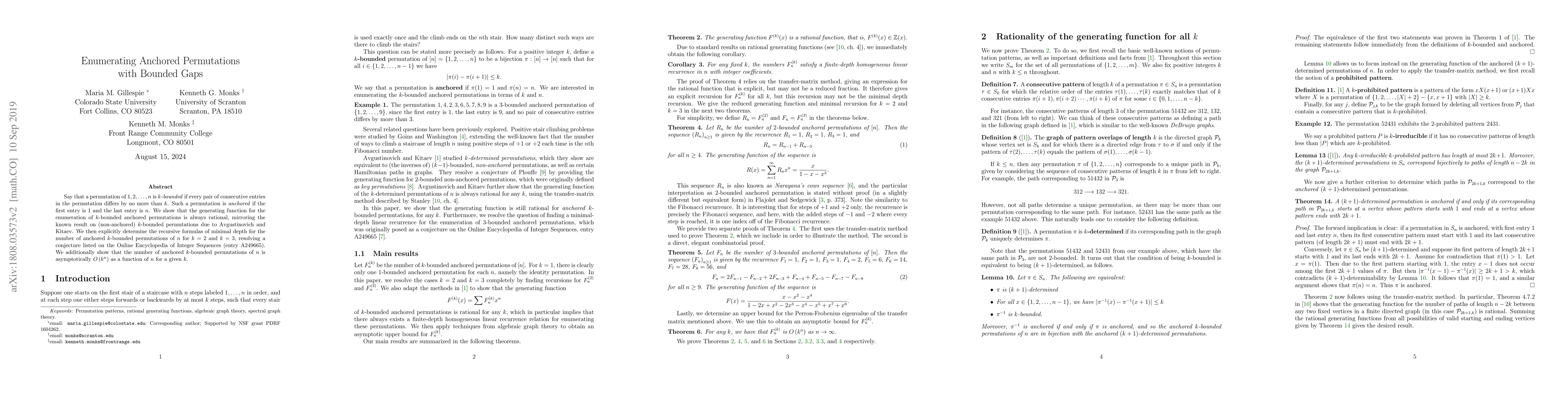 Say that a permutation of $1,2,\ldots,n$ is \textit{$k$-bounded} if every pair of consecutive entries in the permutation differs by no more than $k$. Such a permutation is \textit{anchored} if the first entry is $1$ and the last entry is $n$. We show that the generating function for the enumeration of $k$-bounded anchored permutations is always rational, mirroring the known result on (non-anchored) $k$-bounded permutations due to Avgustinovich and Kitaev. We then explicitly determine the recursive formulas of minimal depth for the number of anchored $k$-bounded permutations of $n$ for $k=2$ and $k=3$, resolving a conjecture listed on the Online Encyclopedia of Integer Sequences (entry A249665). We additionally show that the number of anchored $k$-bounded permutations of $n$ is asymptotically $O\left(k^n\right)$ as a function of $n$ for a given $k$.
