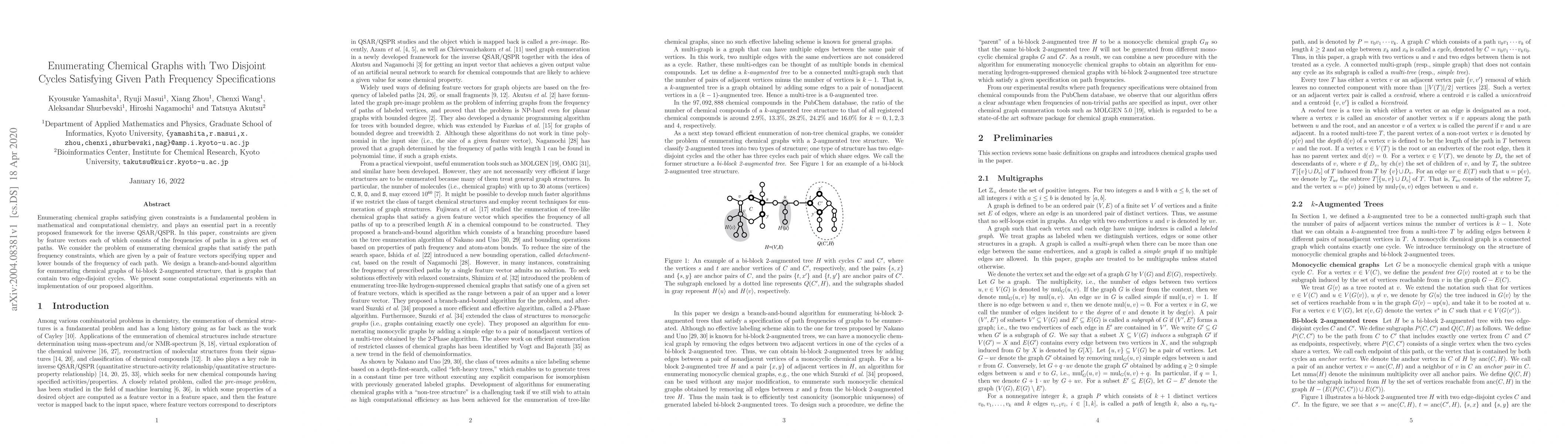 This paper proposes a branch-and-bound algorithm to enumerate chemical graphs with two disjoint cycles that satisfy given path frequency constraints. The algorithm is designed for bi-block 2-augmented structure graphs and is tested through computational experiments.