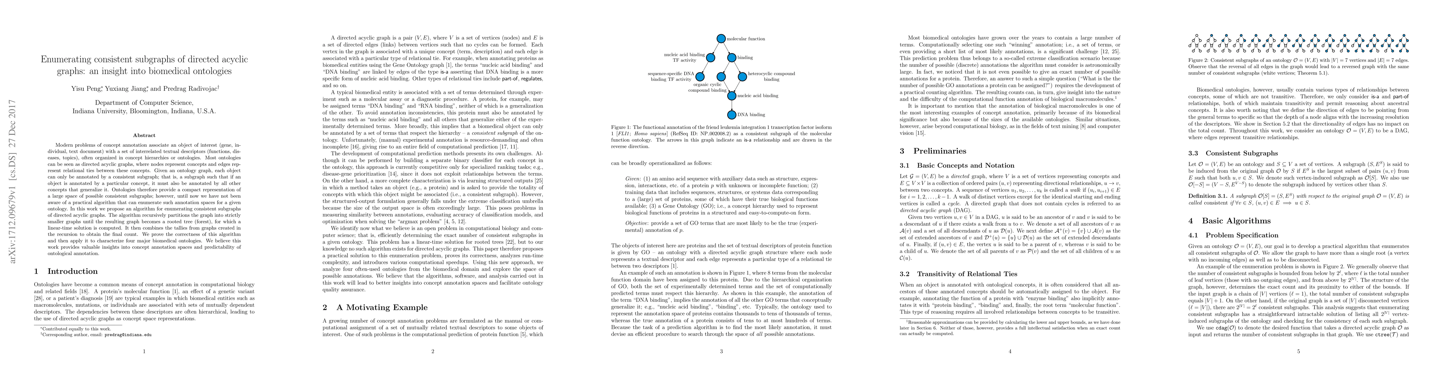This paper introduces an algorithm for enumerating consistent subgraphs in directed acyclic graphs, crucial for understanding concept annotation spaces in biomedical ontologies. The method recursively partitions the graph and combines tallies for a linear-time solution, proven correct and applied to major biomedical ontologies.