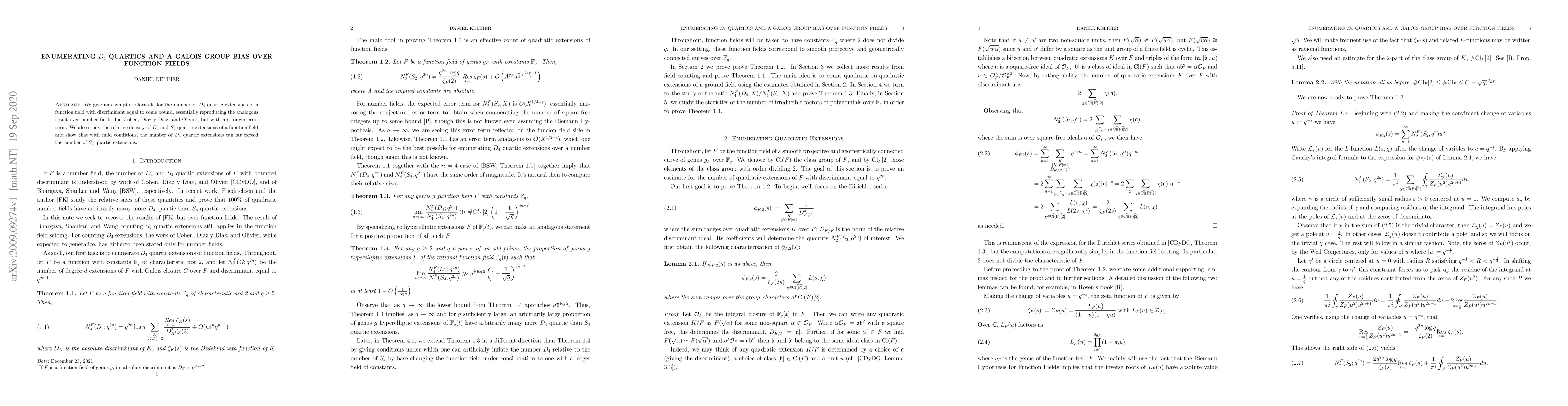 The research provides an asymptotic count for $D_4$ quartic extensions of function fields, achieving a stronger error term than previous results over number fields, and demonstrates that under certain conditions, $D_4$ quartic extensions outnumber $S_4$ quartic extensions.