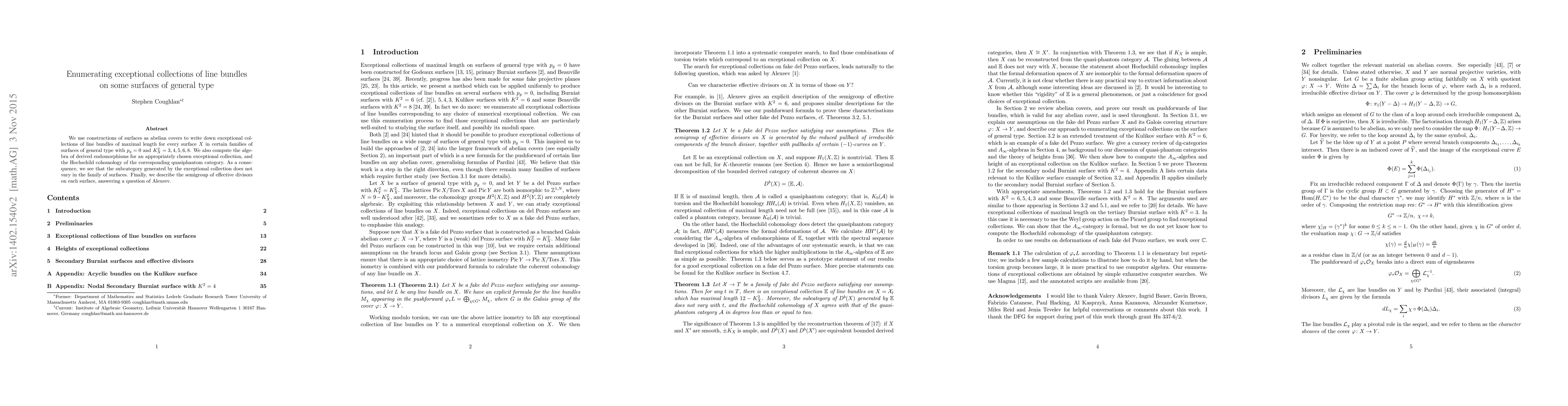 This paper constructs exceptional collections of line bundles for certain surfaces of general type with specific invariants, using abelian covers. It also computes derived endomorphisms and Hochschild cohomology, showing that the subcategory generated by these collections remains consistent across the family of surfaces.