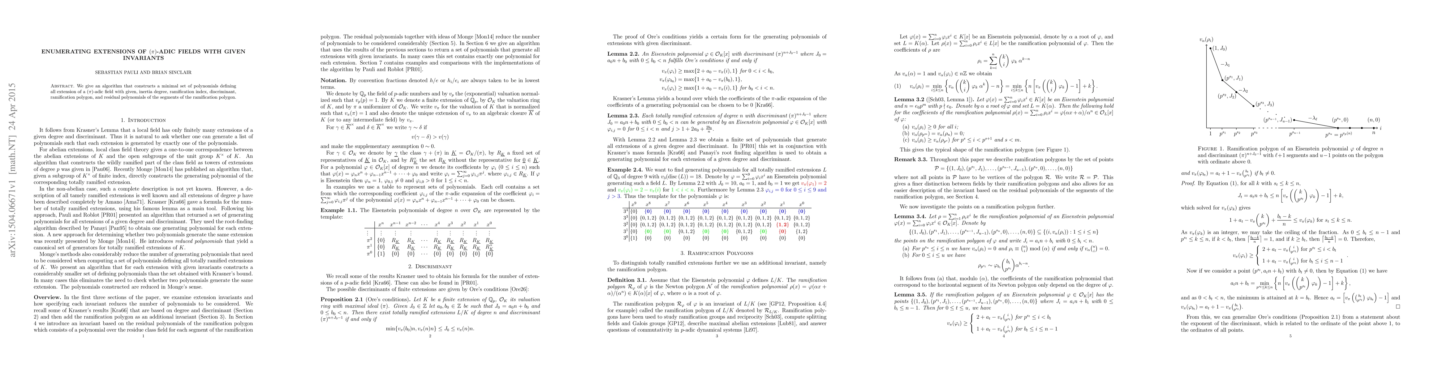 This paper presents an algorithm for constructing a minimal set of polynomials that define all extensions of a $(\pi)$-adic field with specified invariants, including inertia degree, ramification index, discriminant, and ramification polygon details. The method ensures precise control over the extension's properties.