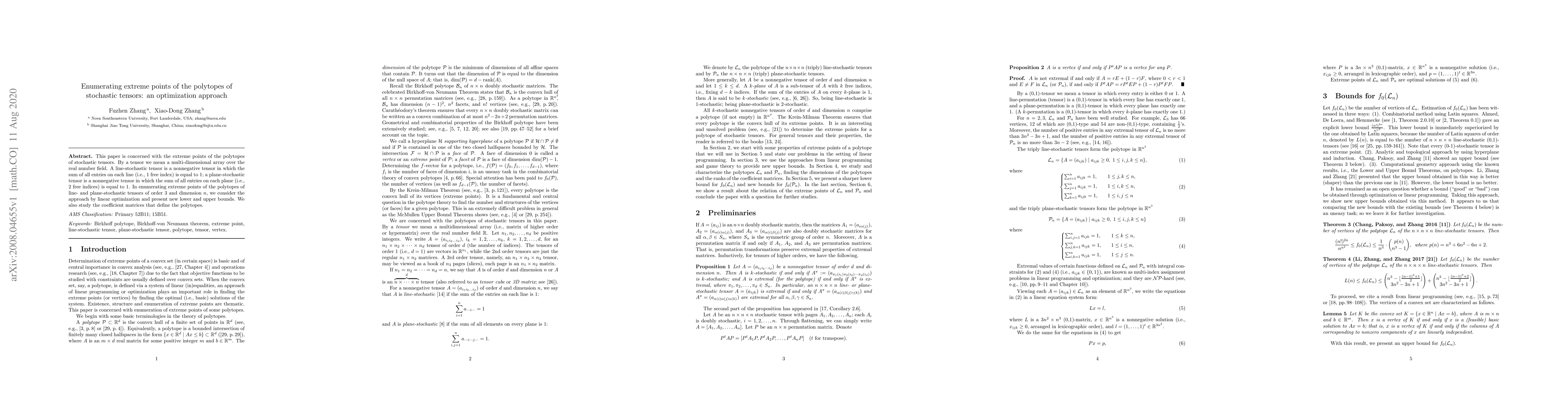 This paper explores the enumeration of extreme points in polytopes of stochastic tensors using linear optimization. It presents new bounds for line- and plane-stochastic tensors of order 3 and dimension $n$, and investigates the coefficient matrices defining these polytopes.