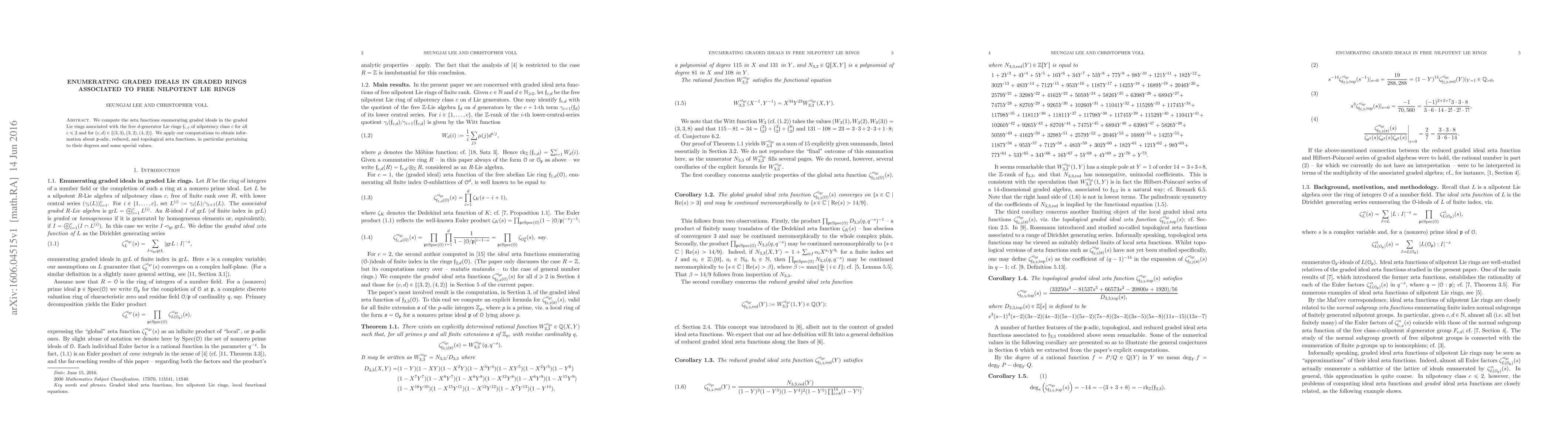 This paper enumerates graded ideals in graded Lie rings linked to free nilpotent Lie rings with specific parameters, computing their zeta functions for cases $c\leq2$ and $(c,d)\in\{(3,3),(3,2),(4,2)\}$. The findings provide insights into $\mathfrak{p}$-adic, reduced, and topological zeta functions, including their degrees and special values.