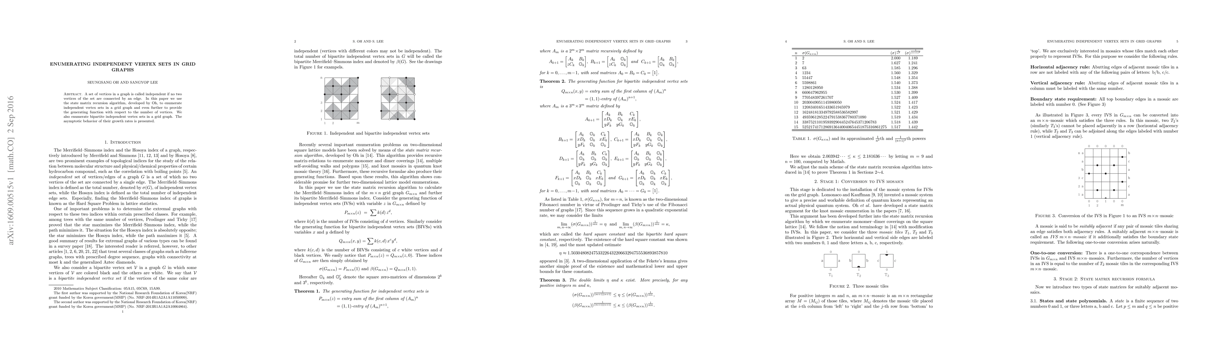 This paper enumerates independent vertex sets in grid graphs using Oh's state matrix recursion algorithm, providing generating functions and analyzing the asymptotic growth of these sets, including bipartite independent vertex sets.