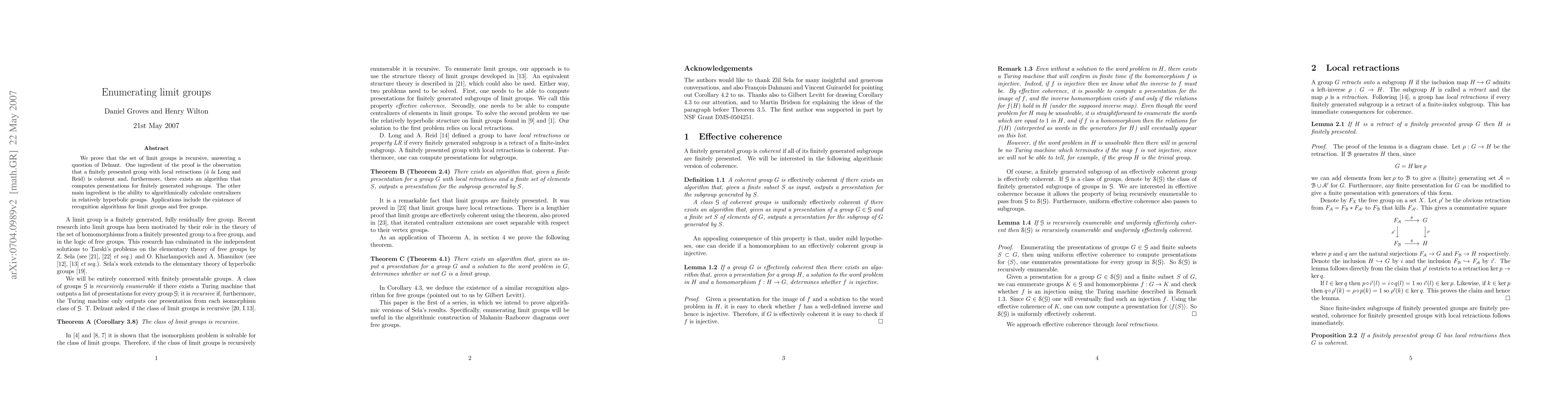 We prove that the set of limit groups is recursive, answering a question of Delzant. One ingredient of the proof is the observation that a finitely presented group with local retractions (a la Long and Reid) is coherent and, furthermore, there exists an algorithm that computes presentations for finitely generated subgroups. The other main ingredient is the ability to algorithmically calculate centralizers in relatively hyperbolic groups. Applications include the existence of recognition algorithms for limit groups and free groups.