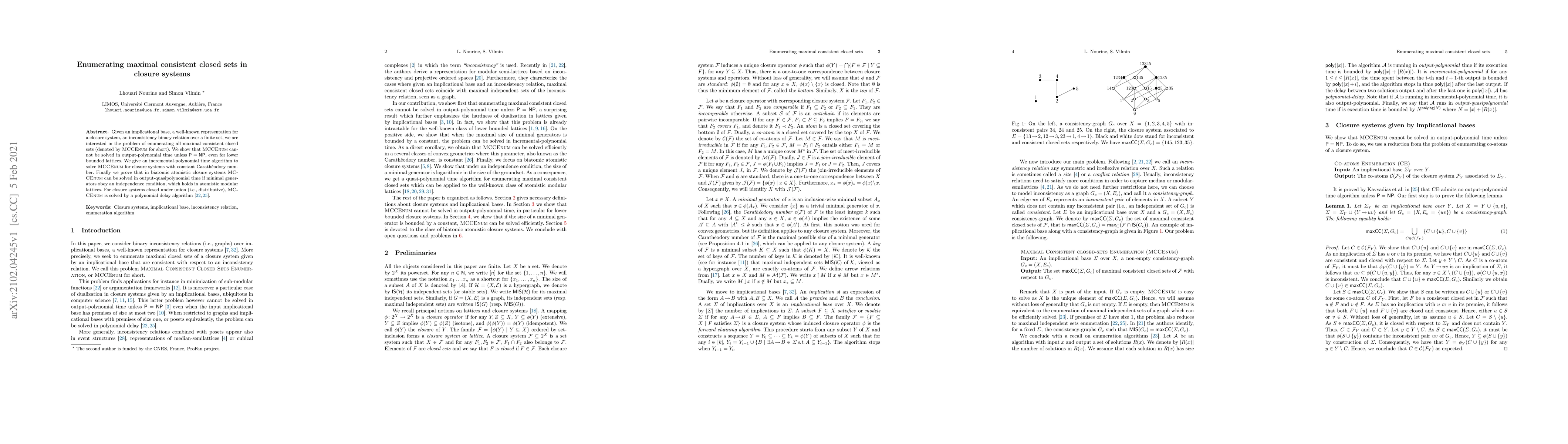 Given an implicational base, a well-known representation for a closure system, an inconsistency binary relation over a finite set, we are interested in the problem of enumerating all maximal consistent closed sets (denoted by MCCEnum for short). We show that MCCEnum cannot be solved in output-polynomial time unless $\textsf{P} = \textsf{NP}$, even for lower bounded lattices. We give an incremental-polynomial time algorithm to solve MCCEnum for closure systems with constant Carath\'eodory number. Finally we prove that in biatomic atomistic closure systems MCCEnum can be solved in output-quasipolynomial time if minimal generators obey an independence condition, which holds in atomistic modular lattices. For closure systems closed under union (i.e., distributive), MCCEnum has been previously solved by a polynomial delay algorithm.