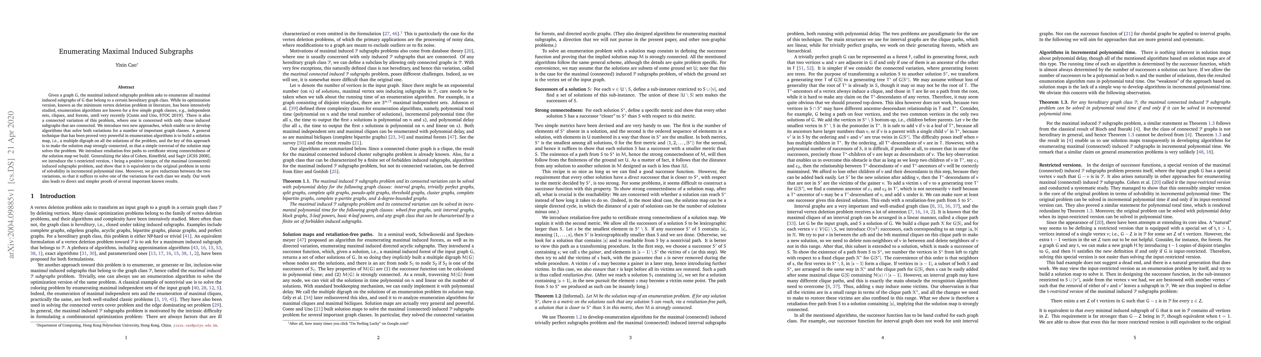 This paper introduces new algorithms for enumerating maximal induced subgraphs within hereditary graph classes, focusing on both general and connected variations. The authors leverage solution maps and introduce retaliation-free paths to ensure strong connectedness, allowing efficient enumeration. They also generalize the problem to $t$-restricted versions and provide reductions between the variations.