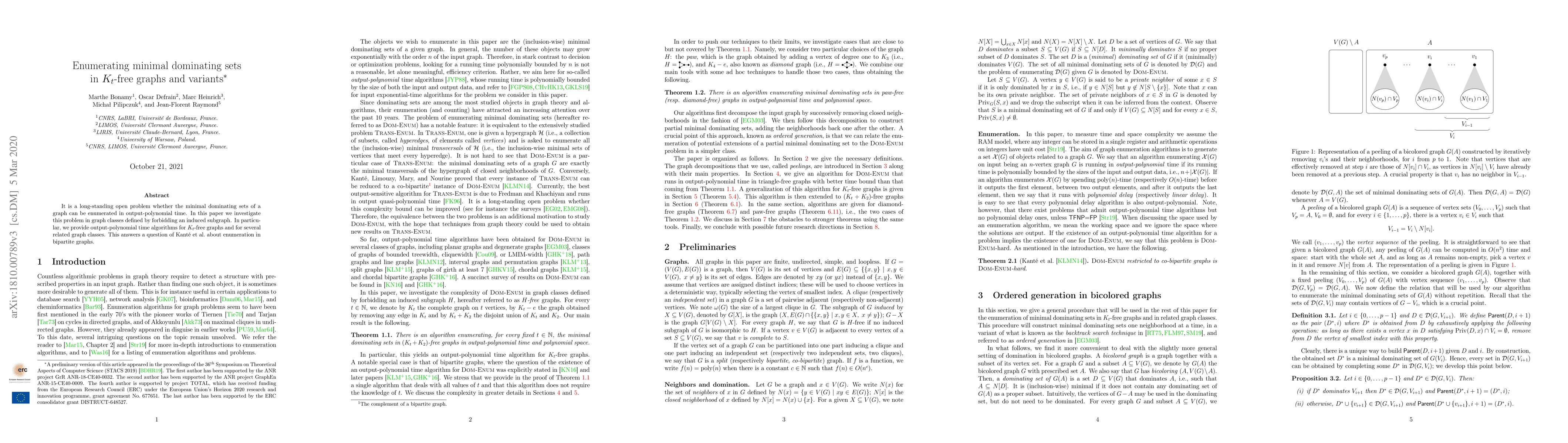 This paper presents output-polynomial time algorithms for enumerating minimal dominating sets in $K_t$-free graphs, addressing a longstanding open problem and extending results to variants, including bipartite graphs. This resolves a question posed by Kanté et al. regarding bipartite graph enumeration.