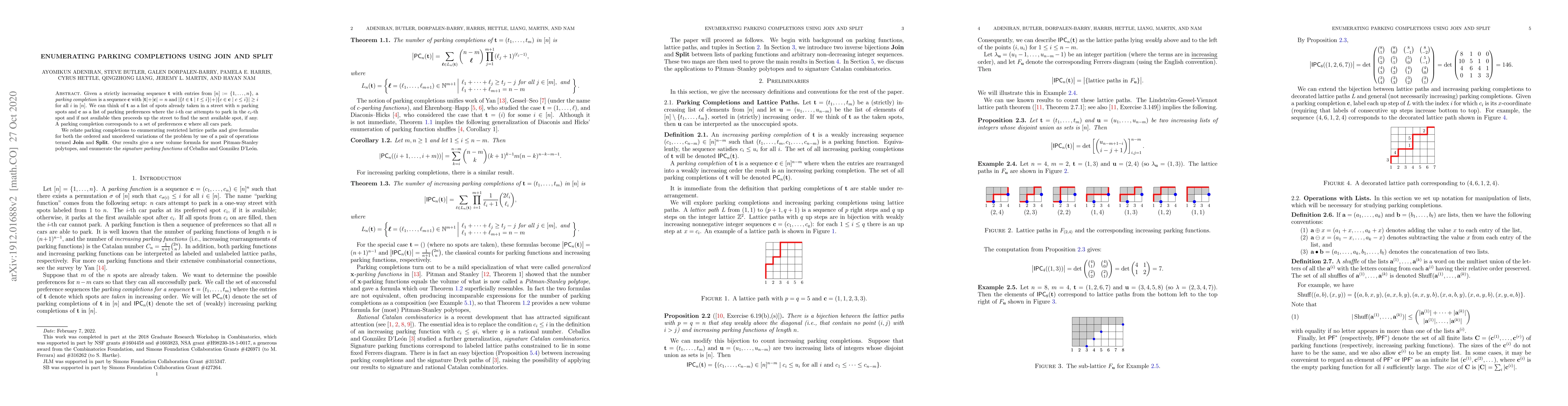 Given a strictly increasing sequence $\mathbf{t}$ with entries from $[n]:=\{1,\ldots,n\}$, a parking completion is a sequence $\mathbf{c}$ with $|\mathbf{t}|+|\mathbf{c}|=n$ and $|\{t\in \mathbf{t}\mid t\le i\}|+|\{c\in \mathbf{c}\mid c\le i\}|\ge i$ for all $i$ in $[n]$. We can think of $\mathbf{t}$ as a list of spots already taken in a street with $n$ parking spots and $\mathbf{c}$ as a list of parking preferences where the $i$-th car attempts to park in the $c_i$-th spot and if not available then proceeds up the street to find the next available spot, if any. A parking completion corresponds to a set of preferences $\mathbf{c}$ where all cars park. We relate parking completions to enumerating restricted lattice paths and give formulas for both the ordered and unordered variations of the problem by use of a pair of operations termed \textbf{Join} and \textbf{Split}. Our results give a new volume formula for most Pitman-Stanley polytopes, and enumerate the signature parking functions of Ceballos and Gonz\'alez D'Le\'on.
