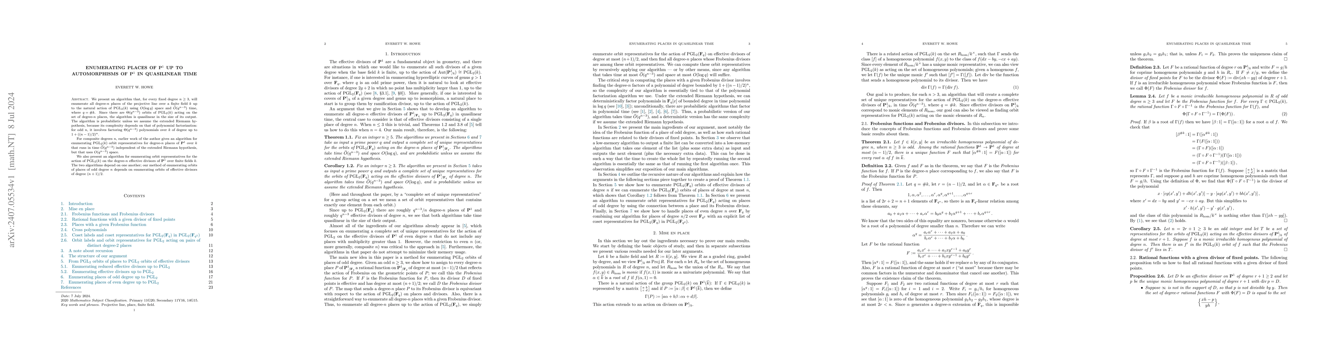 We present an algorithm that, for every fixed degree $n\ge 3$, will enumerate all degree-$n$ places of the projective line over a finite field $k$ up to the natural action of $\operatorname{PGL}_2(k)$ using $O(\log q)$ space and $\widetilde{O}(q^{n-3})$ time, where $q=\#k$. Since there are $\Theta(q^{n-3})$orbits of $\operatorname{PGL}_2(k)$ acting on the set of degree-$n$ places, the algorithm is quasilinear in the size of its output. The algorithm is probabilistic unless we assume the extended Riemann hypothesis, because its complexity depends on that of polynomial factorization: for odd $n$, it involves factoring $\Theta(q^{n-3})$ polynomials over $k$ of degree up to ${1 + ((n-1)/2)^n}$. For composite degrees $n$, earlier work of the author gives an algorithm for enumerating $\operatorname{PGL}_2(k)$ orbit representatives for degree-$n$ places of $\mathbf{P}^1$ over $k$ that runs in time $\widetilde{O}(q^{n-3})$ independent of the extended Riemann hypothesis, but that uses $O(q^{n-3})$ space. We also present an algorithm for enumerating orbit representatives for the action of $\operatorname{PGL}_2(k)$ on the degree-$n$ effective divisors of $\mathbf{P}^1$ over finite fields $k$. The two algorithms depend on one another; our method of enumerating orbits of places of odd degree $n$ depends on enumerating orbits of effective divisors of degree $(n+1)/2$.