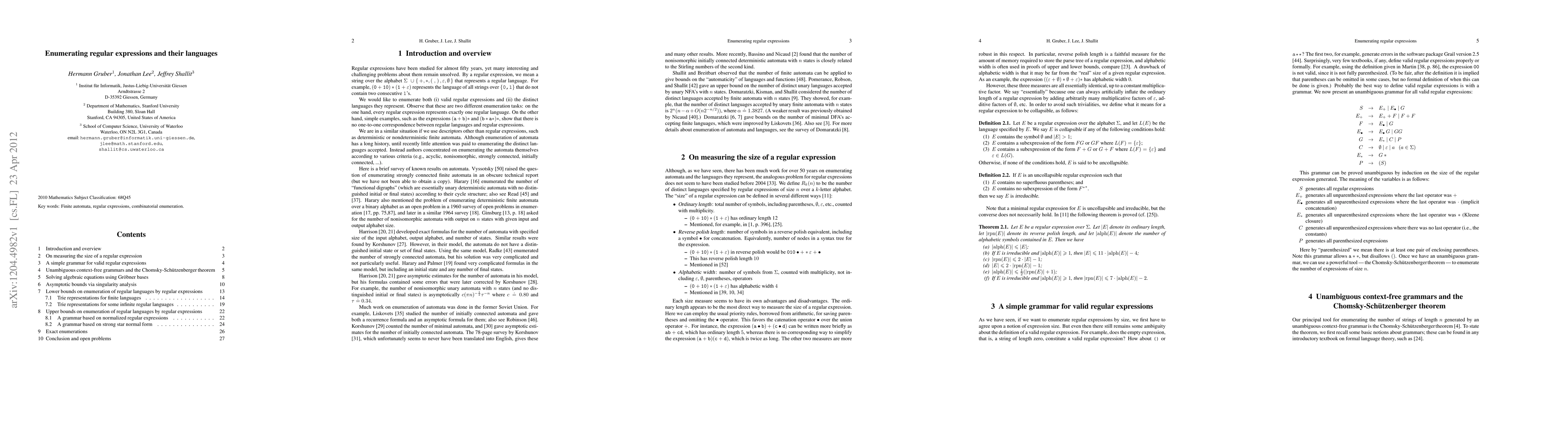 This paper explores the enumeration of distinct regular expressions and the regular languages they represent, using algebraic and analytic methods to derive asymptotic estimates for their sizes. It also provides exact enumeration results for small sizes and discusses the advantages and disadvantages of various expression size definitions.
