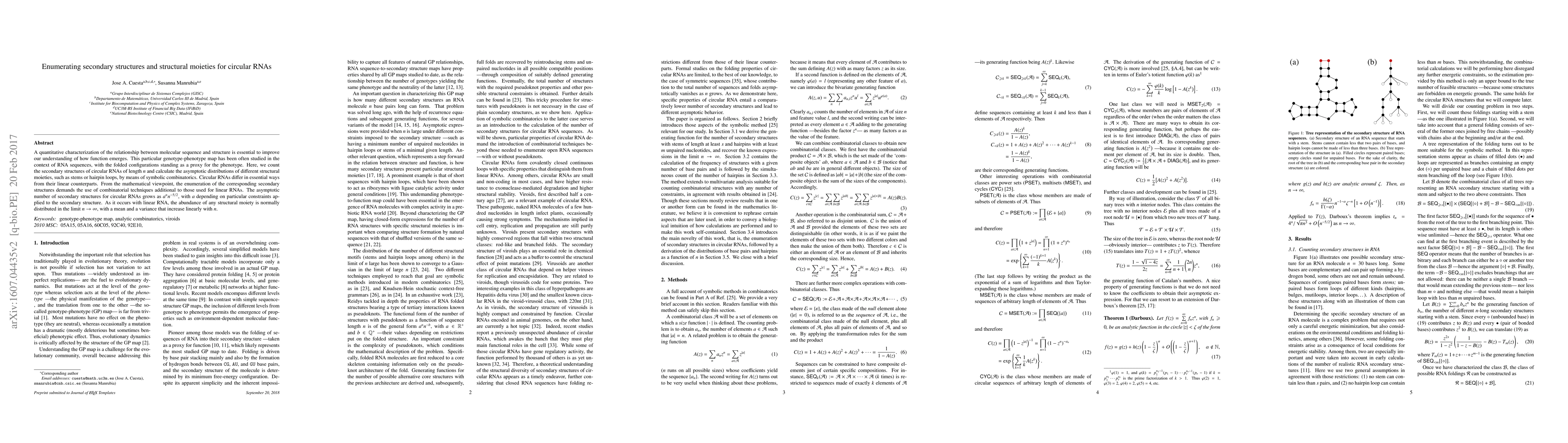 A quantitative characterization of the relationship between molecular sequence and structure is essential to improve our understanding of how function emerges. This particular genotype-phenotype map has been often studied in the context of RNA sequences, with the folded configurations standing as a proxy for the phenotype. Here, we count the secondary structures of circular RNAs of length $n$ and calculate the asymptotic distributions of different structural moieties, such as stems or hairpin loops, by means of symbolic combinatorics. Circular RNAs differ in essential ways from their linear counterparts. From the mathematical viewpoint, the enumeration of the corresponding secondary structures demands the use of combinatorial techniques additional to those used for linear RNAs. The asymptotic number of secondary structures for circular RNAs grows as $a^nn^{-5/2}$, with a depending on particular constraints applied to the secondary structure. The abundance of any structural moiety is normally distributed in the limit $n\to\infty$, with a mean and a variance that increase linearly with $n$.