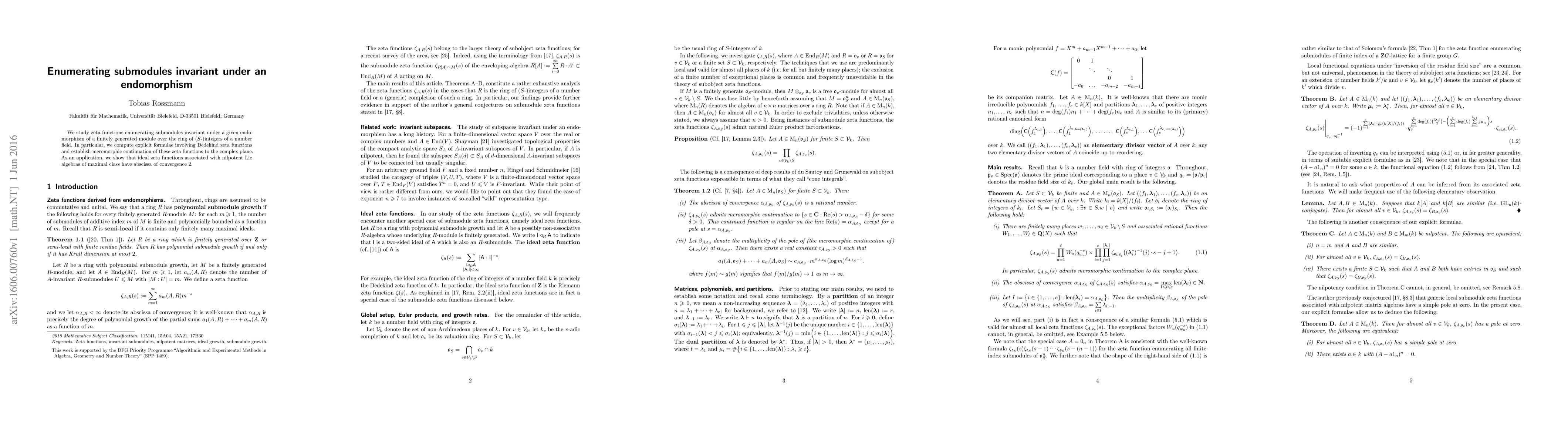 We study zeta functions enumerating submodules invariant under a given endomorphism of a finitely generated module over the ring of ($S$-)integers of a number field. In particular, we compute explicit formulae involving Dedekind zeta functions and establish meromorphic continuation of these zeta functions to the complex plane. As an application, we show that ideal zeta functions associated with nilpotent Lie algebras of maximal class have abscissa of convergence $2$.