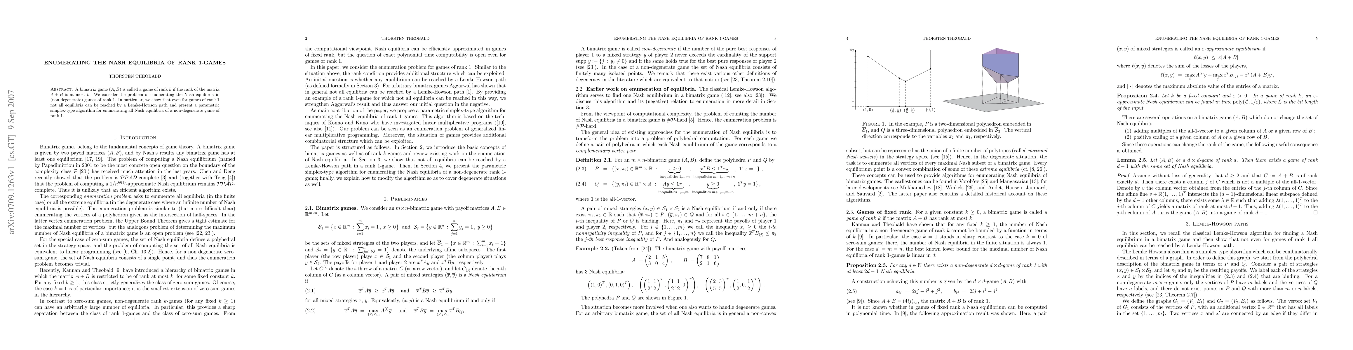 This paper investigates the enumeration of Nash equilibria in non-degenerate rank 1-games, demonstrating that not all equilibria can be reached via Lemke-Howson paths. It introduces a parametric simplex-type algorithm to enumerate all Nash equilibria in such games.