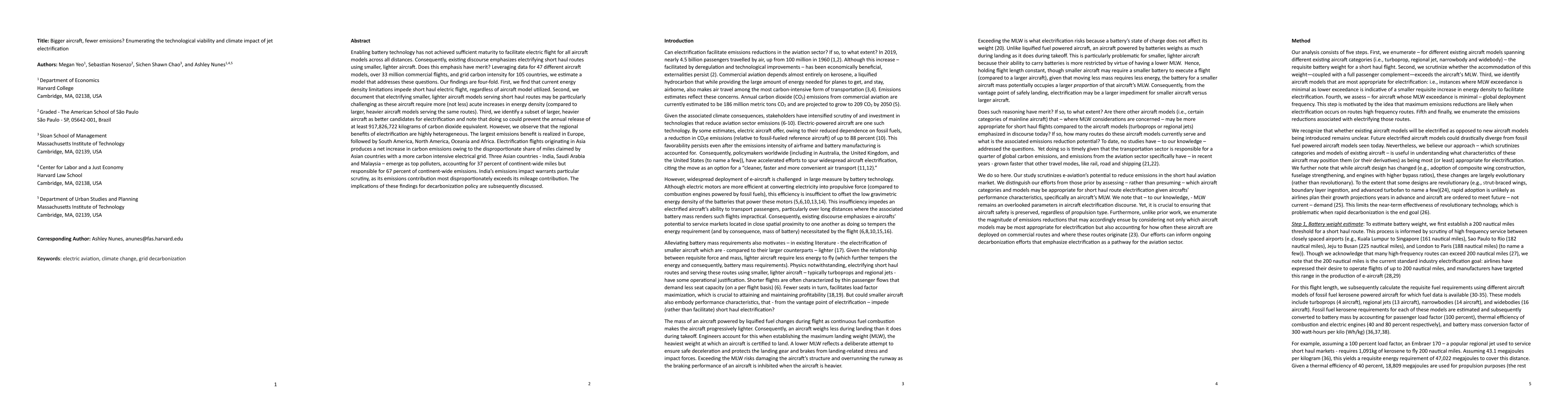 Enabling battery technology has not achieved sufficient maturity to facilitate electric flight for all aircraft models across all distances. Consequently, existing discourse emphasizes electrifying short haul routes using smaller, lighter aircraft. Does this emphasis have merit. We estimate a model that addresses this question. Our findings are fourfold. First, we find that current energy density limitations impede short haul electric flight, regardless of aircraft model utilized. Second, we document that electrifying smaller, lighter aircraft models serving short haul routes may be particularly challenging as these aircraft require more, not less, acute increases in energy density. Third, we identify a subset of larger, heavier aircraft as better candidates for electrification and note that doing so could prevent the annual release of significant amounts of carbon dioxide equivalent. However, we observe that the regional benefits of electrification are highly heterogeneous. The largest emissions benefit is realized in Europe, followed by South America, North America, Oceania and Africa. Electrification flights originating in Asia produces a net increase in carbon emissions owing to the disproportionate share of miles claimed by Asian countries with a more carbon intensive electrical grid. Indian emissions warrant scrutiny, as its emissions contribution most disproportionately exceeds its mileage contribution. The implications of these findings for decarbonization policy are subsequently discussed.